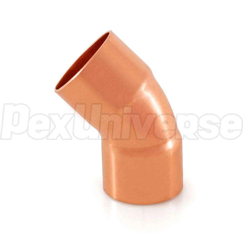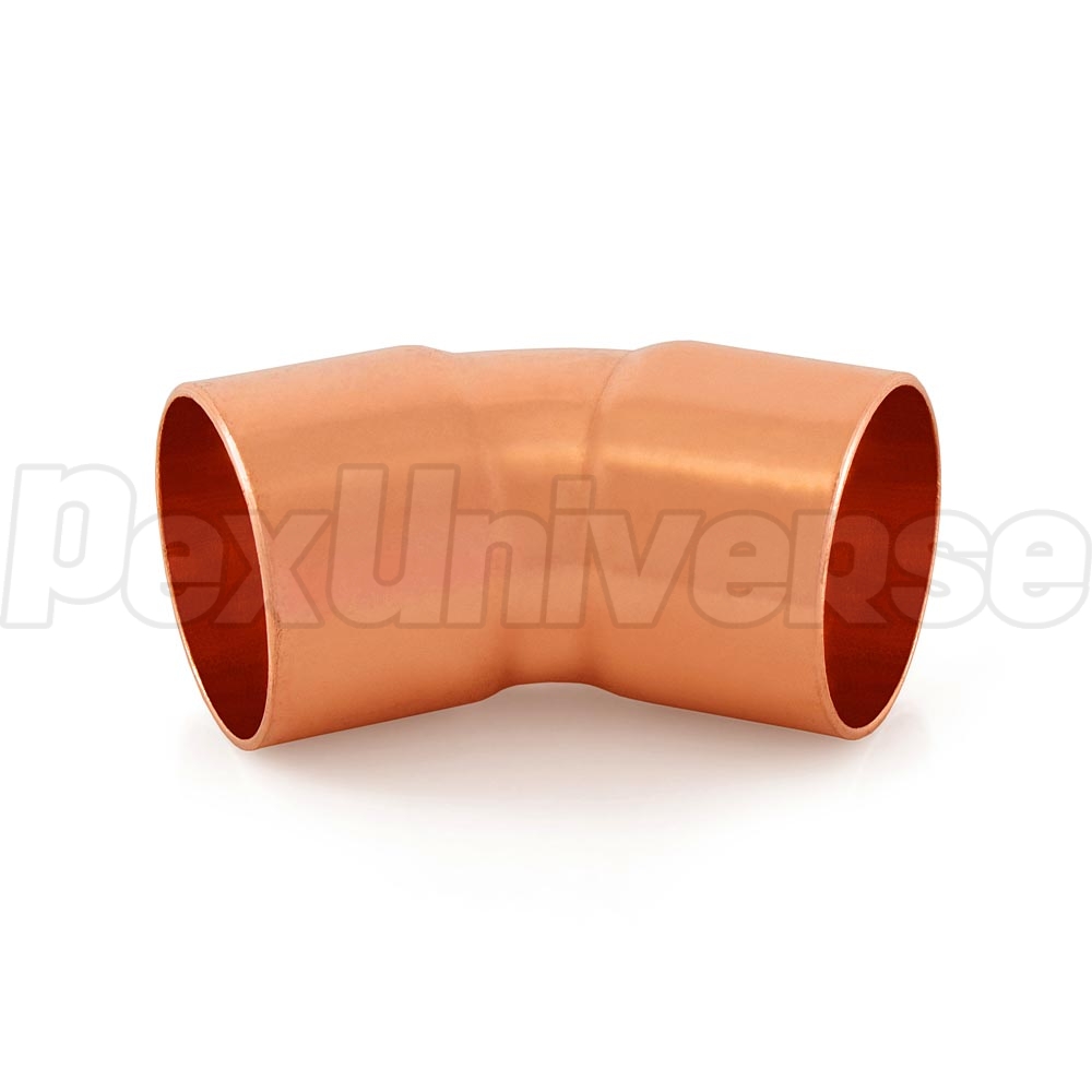 This female sweat x female sweat elbow connects two 1-1/4" copper pipes at a 45-degree angle.