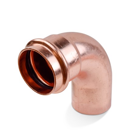 This copper press elbow is used to connect 1-1/4" copper pipe to 1-1/4" press fitting outlet at a 90-degree angle.