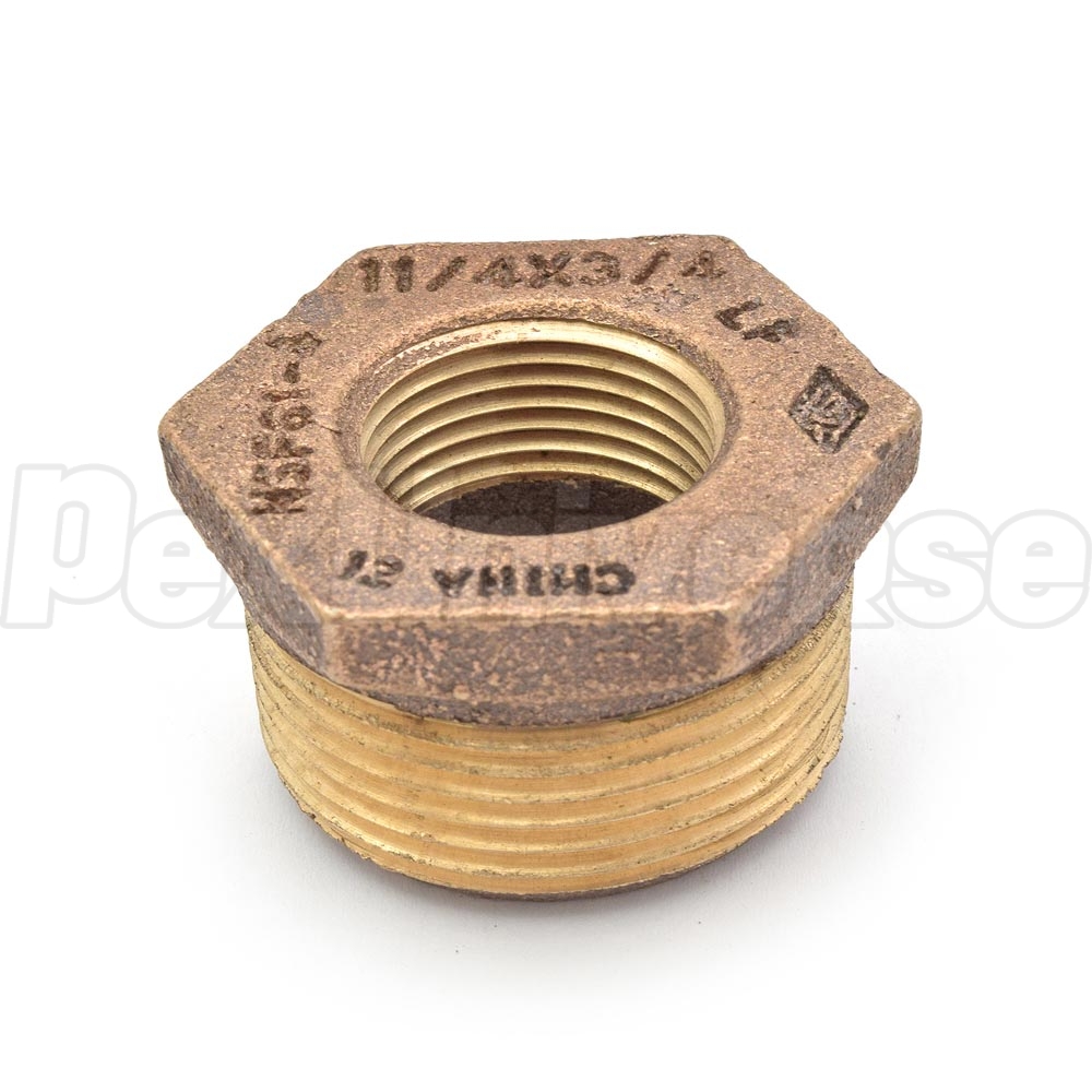 1-1/4" x 3/4" FPT x MPT (FIP x MIP) threaded bushing with hex head, intended to provide a transition from a smaller size threaded pipe to a larger size female threaded fitting or an outlet.
