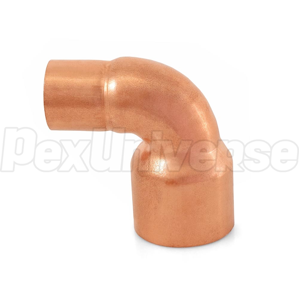 This female sweat x female sweat elbow connects 3/4" copper pipe to 1-1/4" copper pipe at a 90-degree angle.
