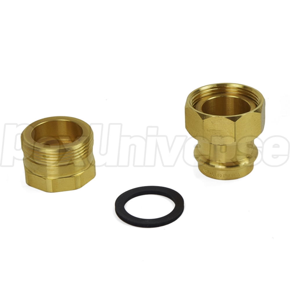 A lead-free brass union with 1-1/4" press x to a 1-1/4" FPT (female NPT threaded) connections.