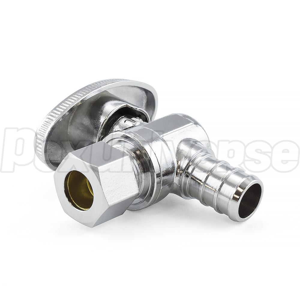 PEX Stop Valve, angle type, with 1/4-turn handle. 1/2" PEX (inlet) x 3/8" OD Compression (outlet). Lead-Free chrome plated brass. Approved for potable water use. UPC certified and meets NSF/ANSI 372 & 61-g.