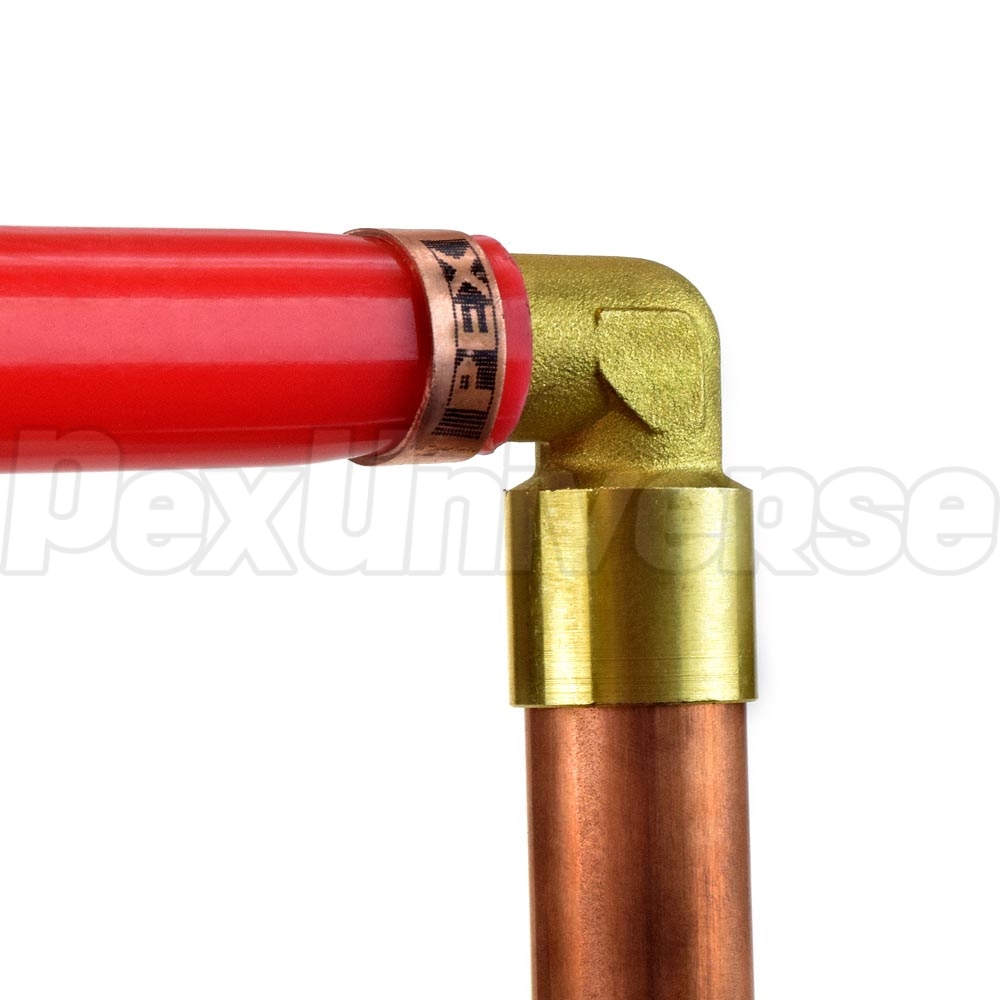 PEX x Copper Pipe (Female Sweat) Elbow is used to transition between PEX tubing and a copper pipe at a 90-degree angle.