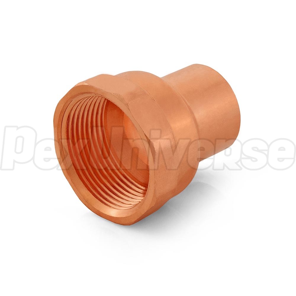 This FPT x female sweat fitting connects 1" copper pipe to 1-1/4" male threaded pipe or fitting.