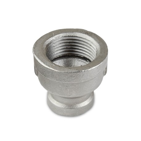This stainless steel reducing coupling connects 1" to 1/2" male NPT threaded pipes together in a straight line.