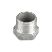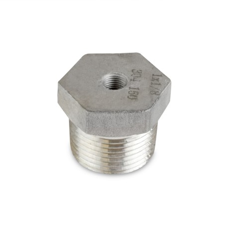 This stainless steel hex head bushing connects 1/8" male NPT threaded pipe to a 1" female NPT threaded outlet or fitting in a straight line.