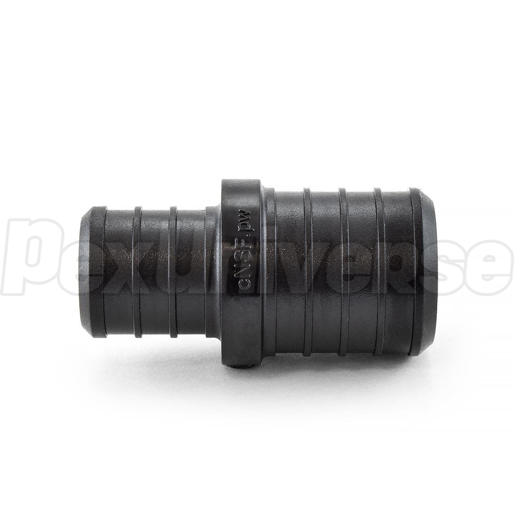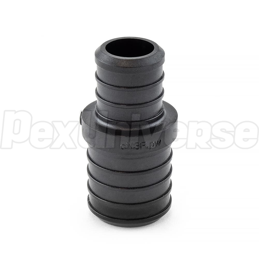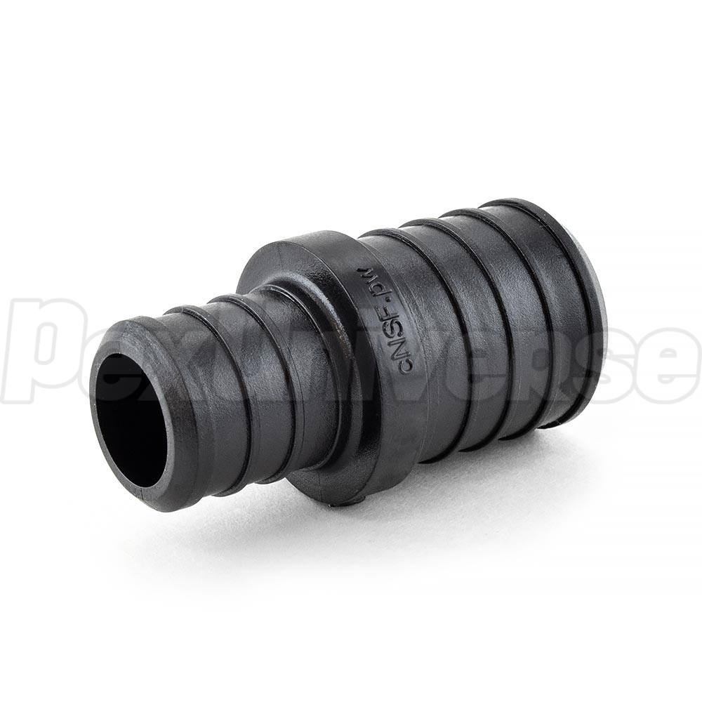 Reducing poly alloy PEX coupling connects 1" to 3/4" PEX in a straight line.