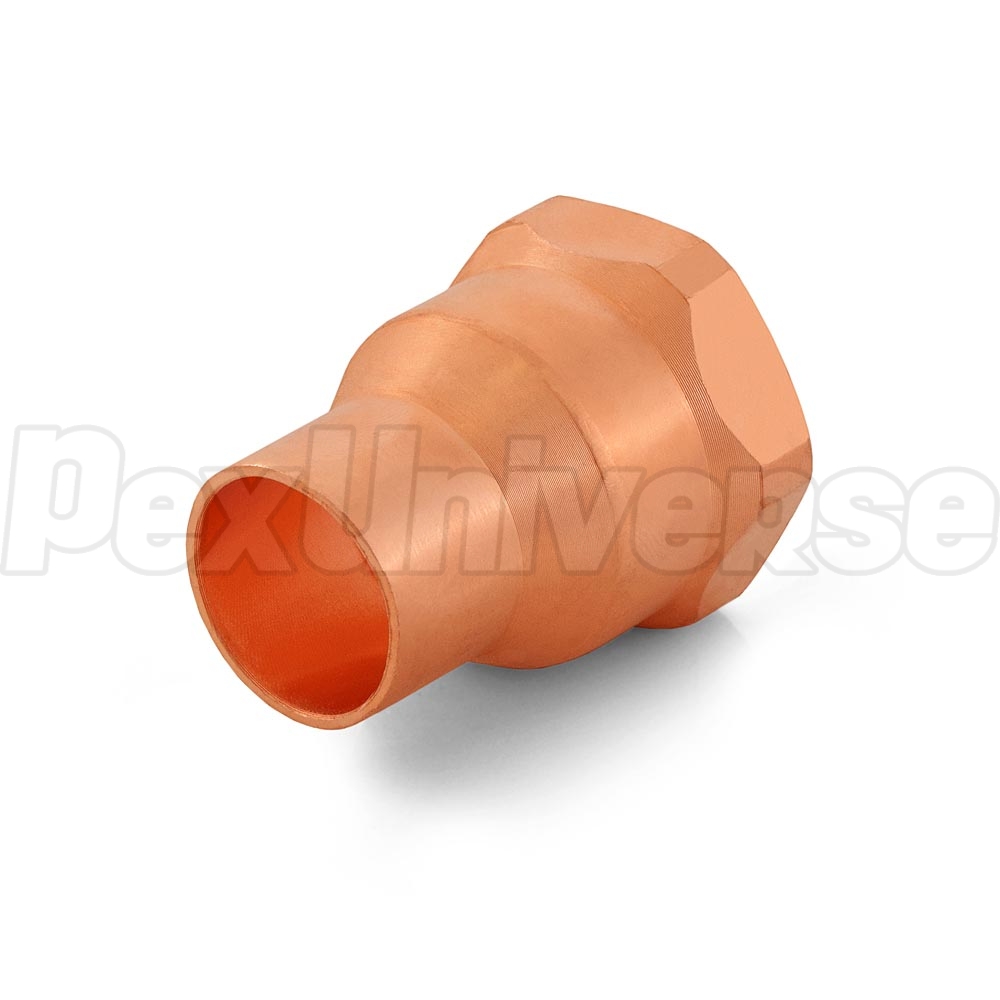 This FPT x female sweat fitting connects 3/4" copper pipe to 1" male threaded pipe or fitting.