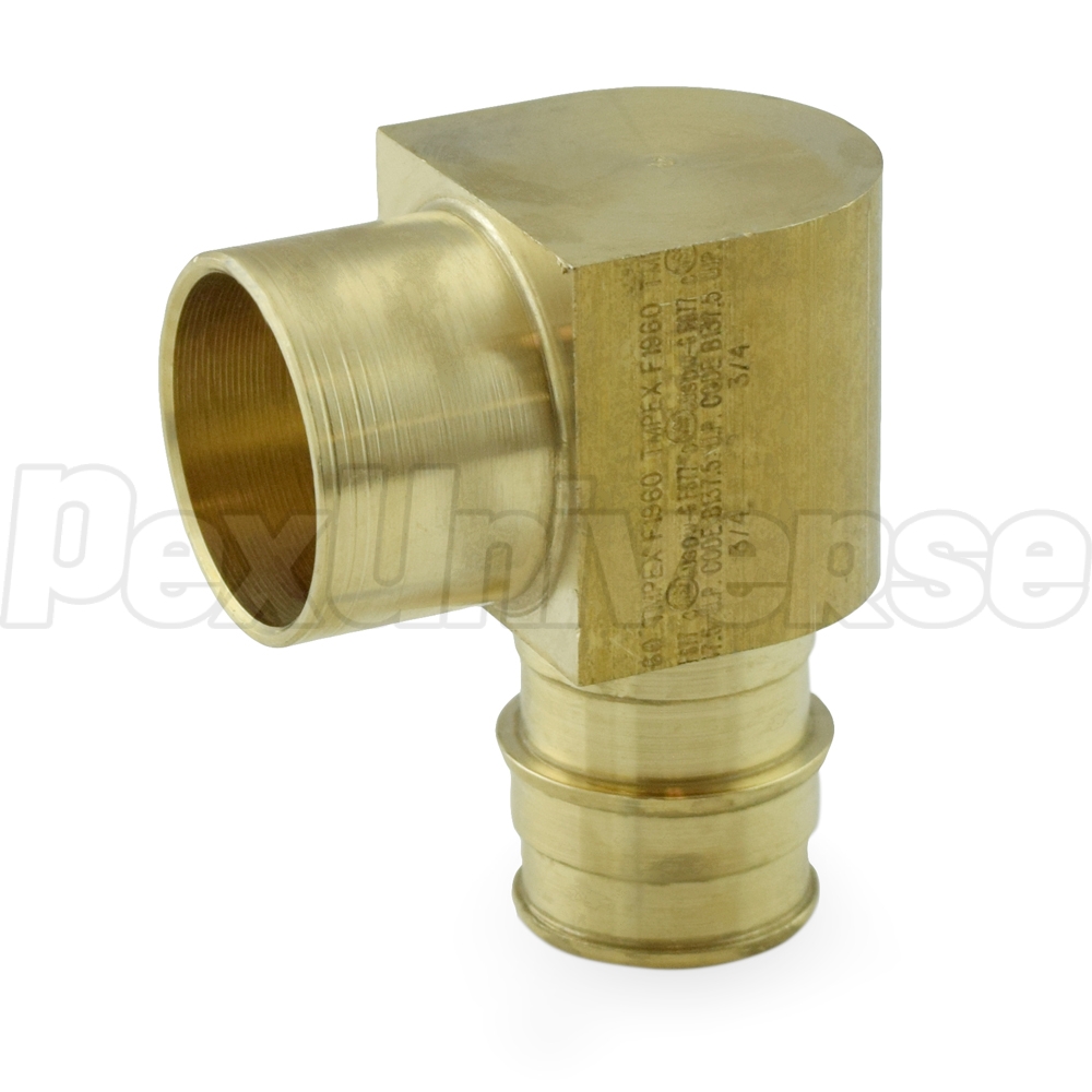 This fitting allows to transition from 3/4" PEX-A tubing to 3/4" copper pipe at a 90-degree elbow, using PEX expansion method. Compatible with all brands or PEX-A tubing (Uponor/Wirsbo hePEX & AquaPEX, Sioux Chief, Mr. PEX, Rehau, etc.). Sweat part of the fitting must be soldered first.