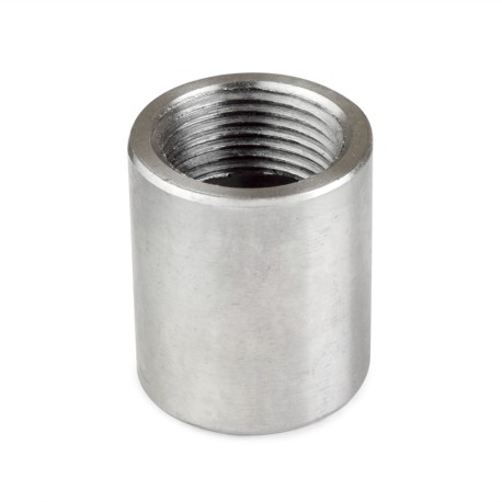 This stainless steel full (merchant) coupling connects two 3/4" NPT threaded pipes together in a straight line.