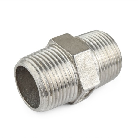 This stainless steel hex pipe nipple is used to connect two 3/4" NPT threaded fittings/valves together in a straight line.