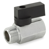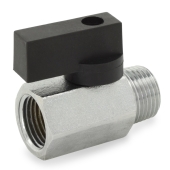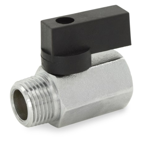 3/8" MNPT x 3/8" FNPT threaded, 1/4-turn, chrome plated mini brass ball valve. The handle is positioned away from the MPT side, allowing to connect the valve directly to a female threaded fitting, tank outlet, flanged connection, etc.