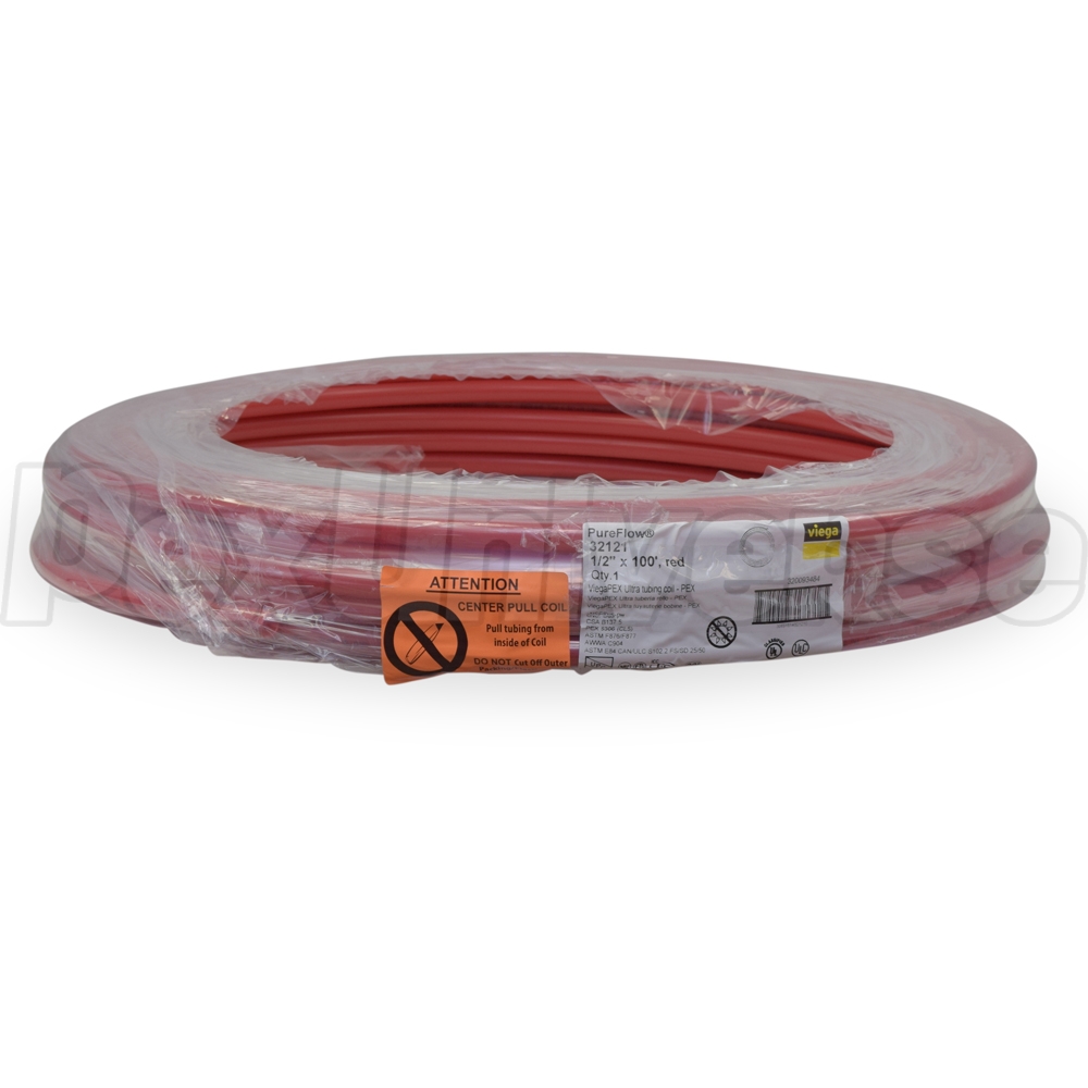100ft coil of 1/2" ViegaPEX Ultra (Non-Barrier) plumbing PEX-b type tubing (red color). Intended to use in hot & cold water potable water applications using press or crimp connection systems.