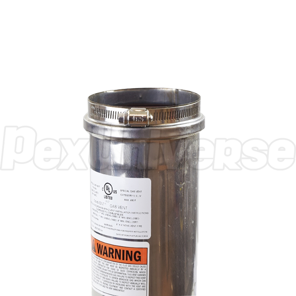 4" size x 4ft long Nova-Vent pipe by Z-Flex (actual length is 48" overall). Designed for category III (non-condensing, power vented) and IV (condensing, power vented) appliances, including water heaters, boilers, etc. Note: NovaVent is an economic alternative to Z-Vent made by the same company from a different grade of stainless steel and meets the same standards. It can be used in place of Z-Vent pipe where permitted, especially for Category III (standard efficiency/non-condensing, fan assisted) vented appliances.