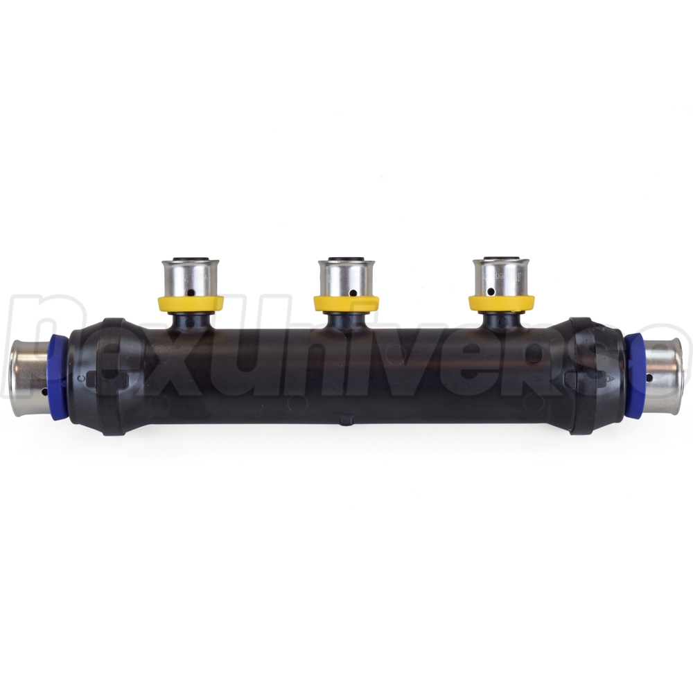 Viega manifold with (3) 1/2" PEX press outlets (branches), 3/4" PEX press inlet and outlet. Open (flow-through) design.