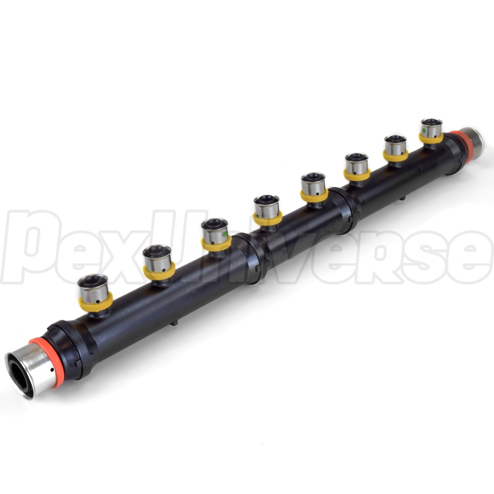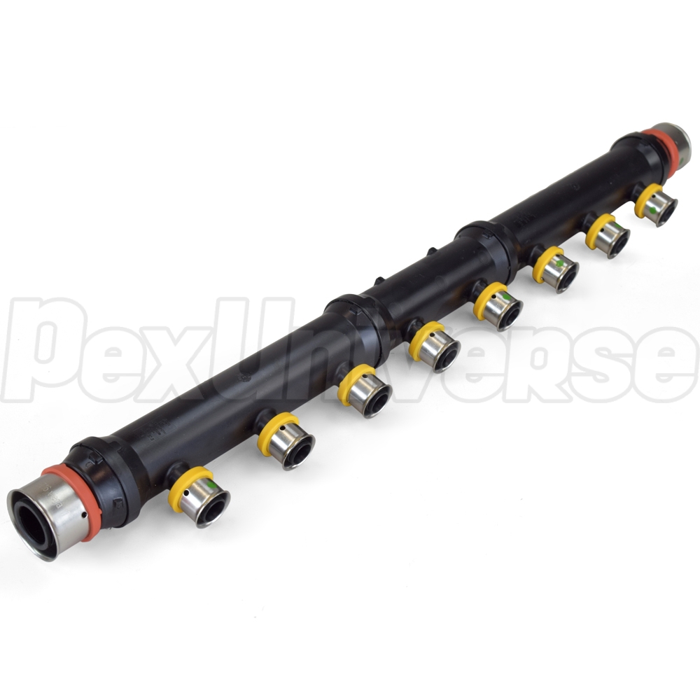 Viega manifold with (8) 1/2" PEX press outlets (branches), 1" PEX press inlet and outlet. Open (flow-through) design.