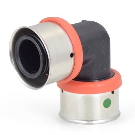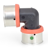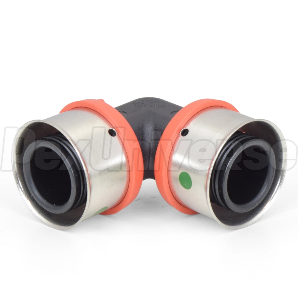 This poly PEX press elbow fitting connects two 1" PEX pipes at a 90° angle using Viega press connection method. Compatible with all PEX tubing types (A, B, C) and FostaPEX. Lead-free, approved for potable water use.