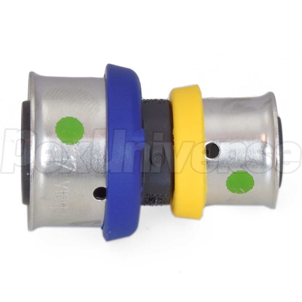 This poly PEX press coupling fitting connects 1/2" to 3/4" PEX pipe in a straight line using Viega press connection method. Compatible with all PEX tubing types (A, B, C) and FostaPEX. Lead-free, approved for potable water use.
