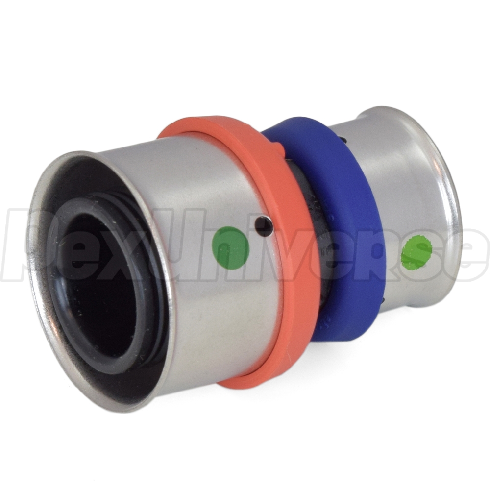 This poly PEX press coupling fitting connects 3/4" to 1" PEX pipe in a straight line using Viega press connection method. Compatible with all PEX tubing types (A, B, C) and FostaPEX. Lead-free, approved for potable water use.