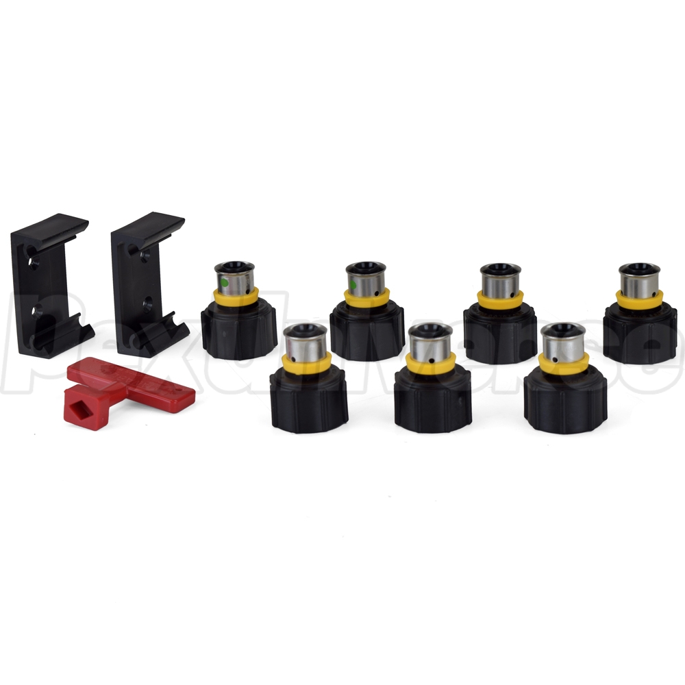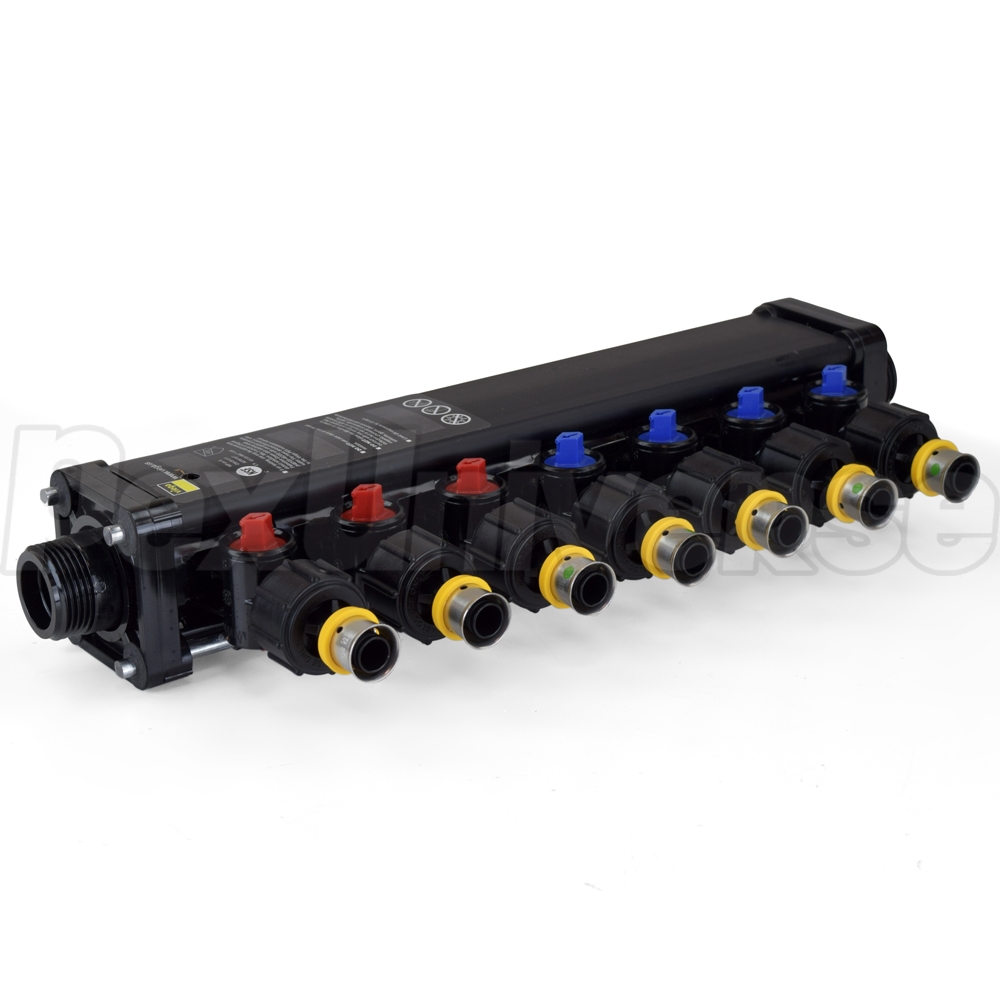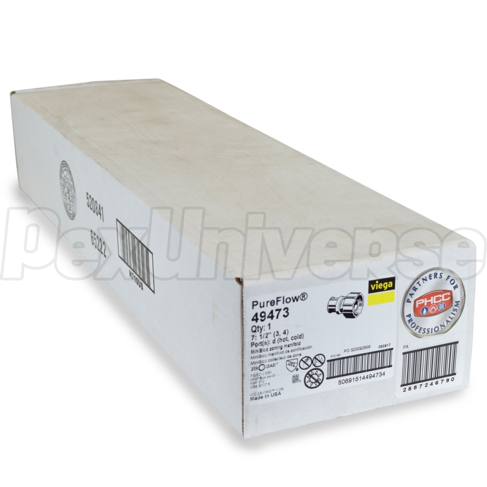 Viega MiniBloc manifold with (7) 1/2" PEX Press ports - (3) hot and (4) cold. Intended for use with ViegaPEX Ultra (Potable/Non-barrier) and Viega FostaPEX tubing and Press connection method. Also compatible with all other types (A, B, C) and brands of PEX tubing. Each port (branch) is equipped with a built-in 1/4 turn shut-off valve for individual fixture control. Includes PEX adapters for all ports (branches) and Valve Key.