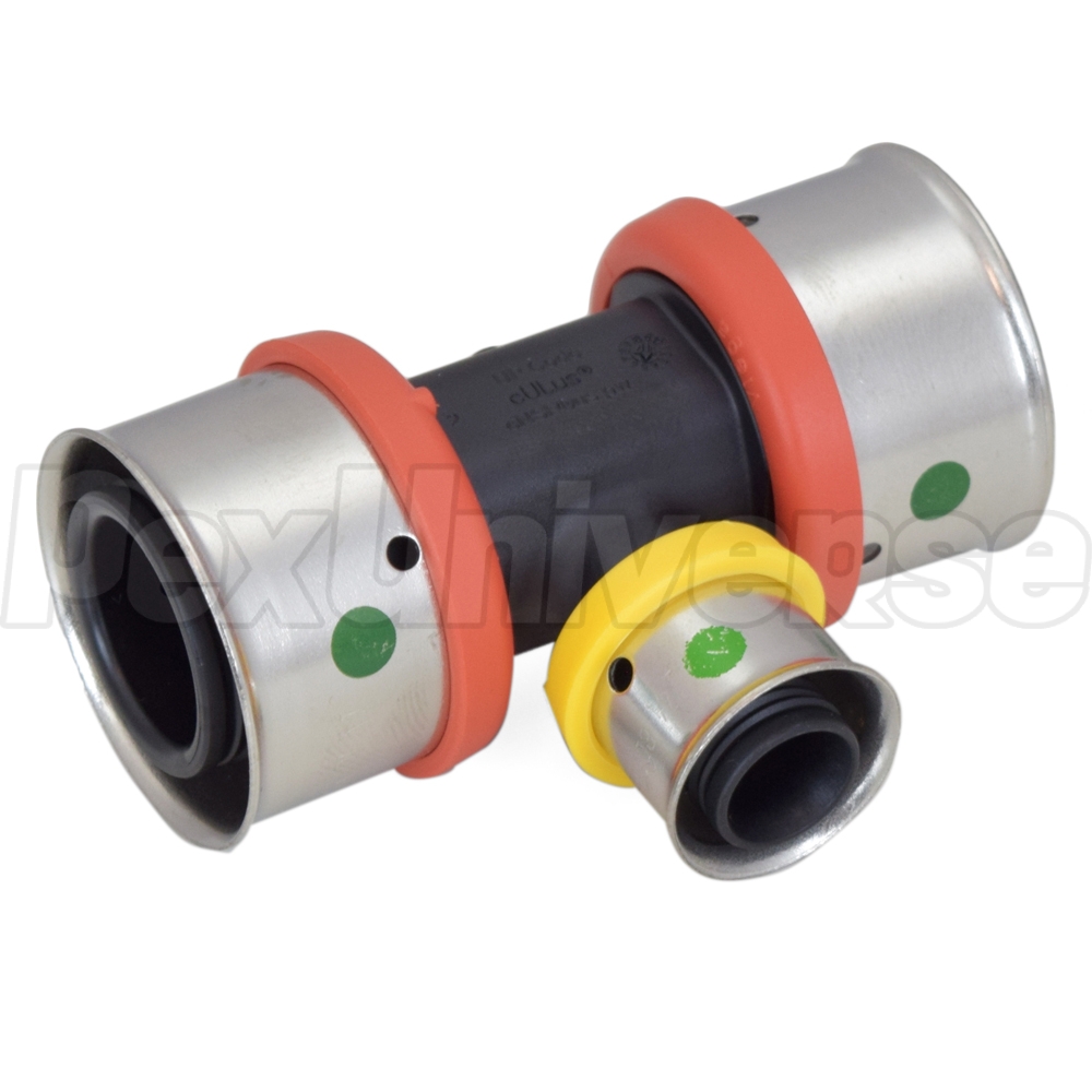 This poly PEX press tee fitting connects three PEX pipes (1" side x 1" side x 1/2" top/middle) together in a "T" pattern using Viega press connection method. Compatible with all PEX tubing types (A, B, C) and FostaPEX. Lead-free, approved for potable water use.