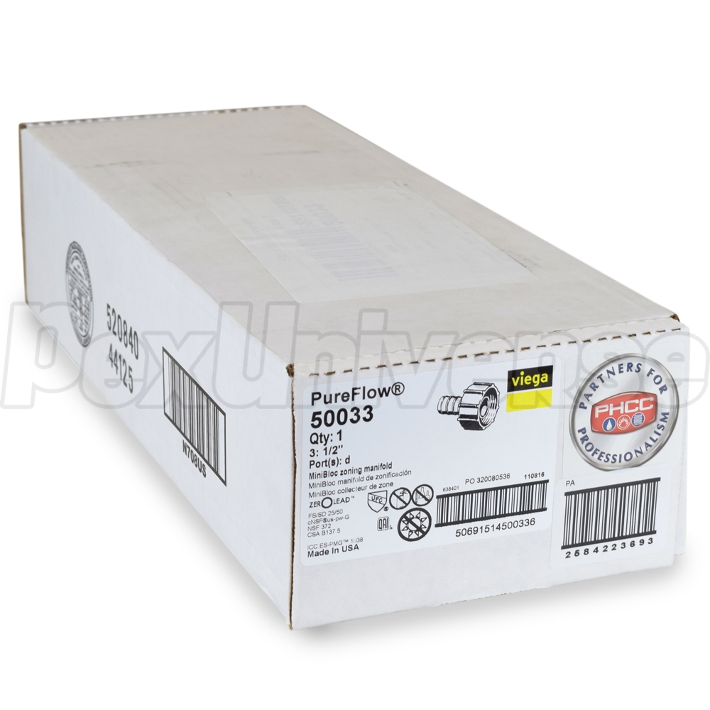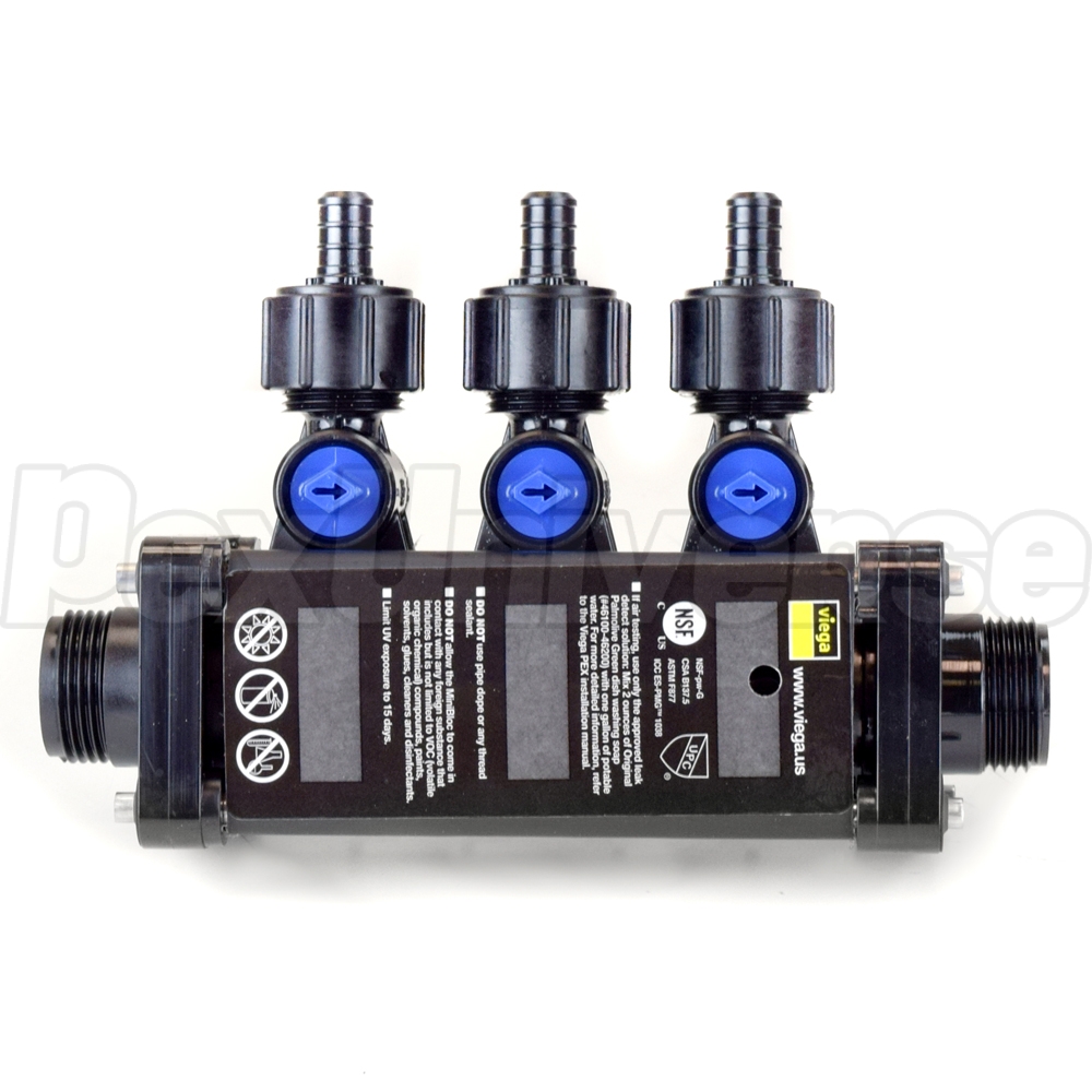 Viega MiniBloc manifold with (3) 1/2" PEX Crimp ports. Intended for use with ViegaPEX Ultra (Potable/Non-barrier) tubing and Crimp connection method. Also compatible with all other types (A, B, C) and brands of PEX tubing. Each port (branch) is equipped with a built-in 1/4 turn shut-off valve for individual fixture control. Includes PEX adapters for all ports (branches) and Valve Key.