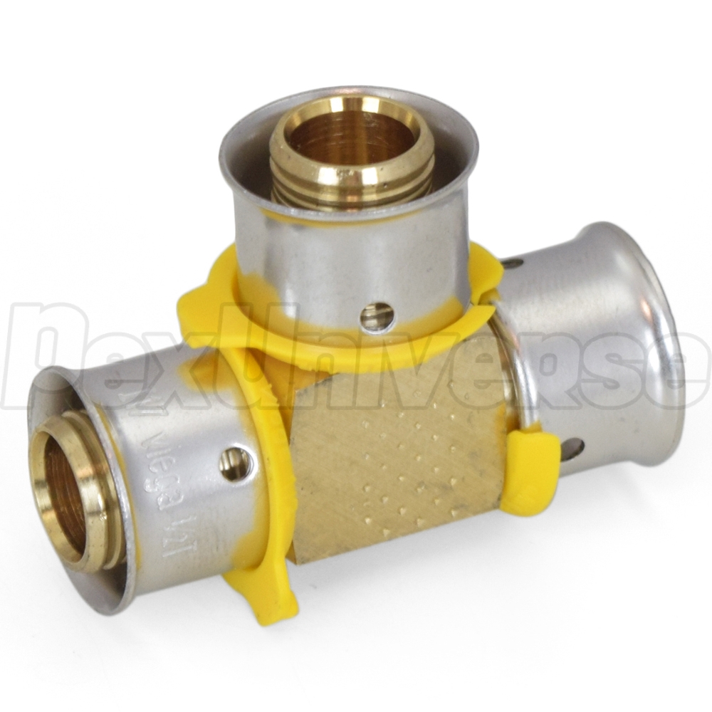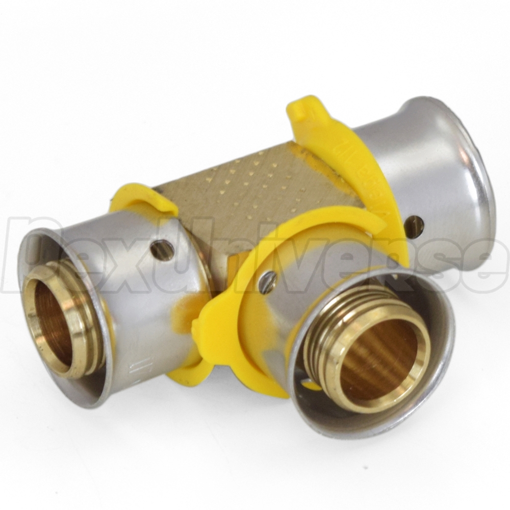 This bronze PEX press tee fitting connects three 1/2" PEX pipes together in a "T" pattern using Viega press connection method. Compatible with all PEX tubing types (A, B, C) and FostaPEX. Lead-free, approved for potable water use.