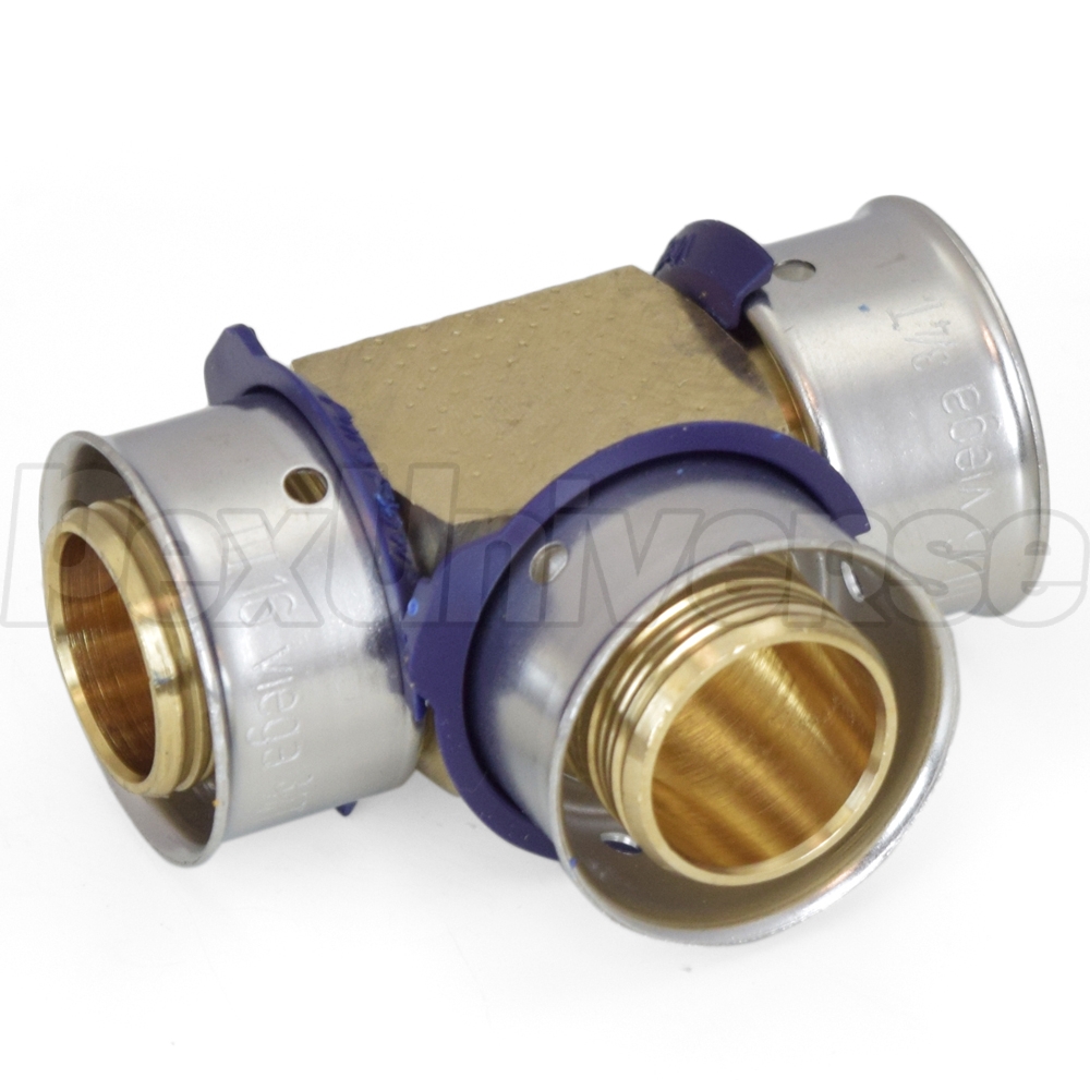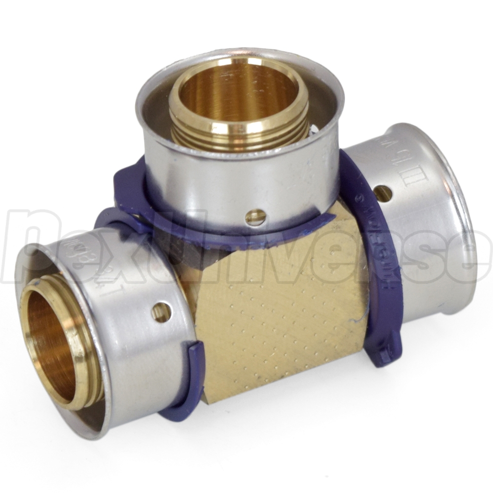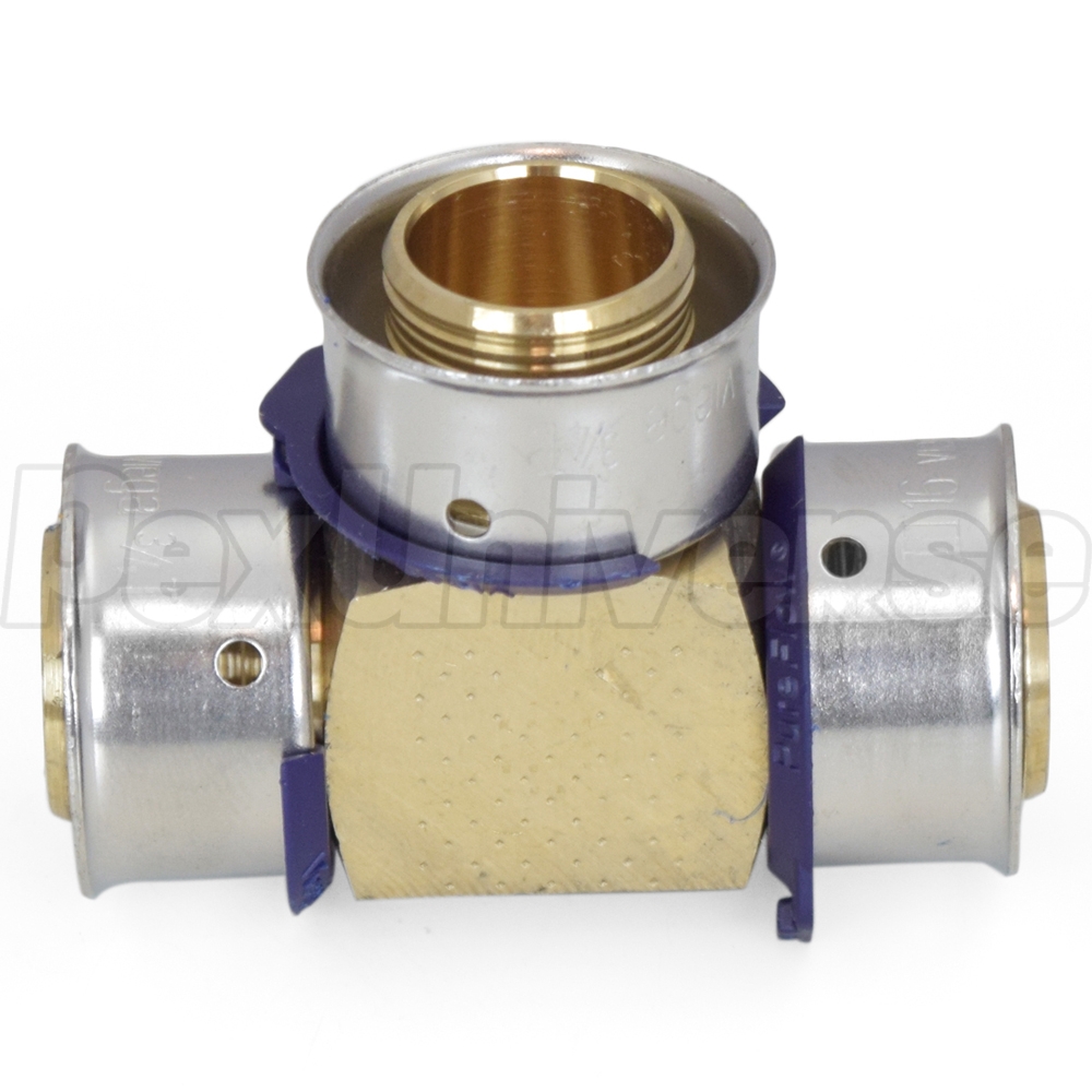 This bronze PEX press tee fitting connects three 3/4" PEX pipes together in a "T" pattern using Viega press connection method. Compatible with all PEX tubing types (A, B, C) and FostaPEX. Lead-free, approved for potable water use.