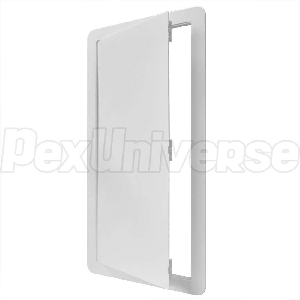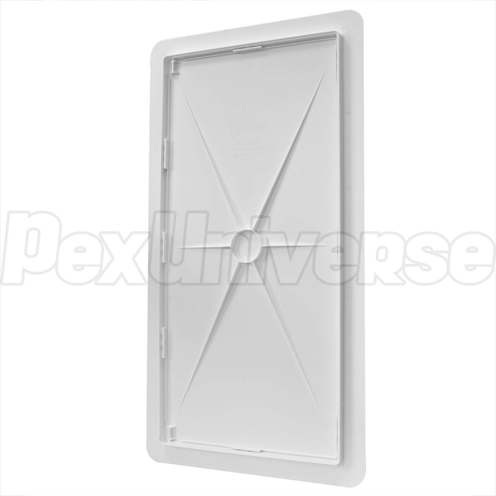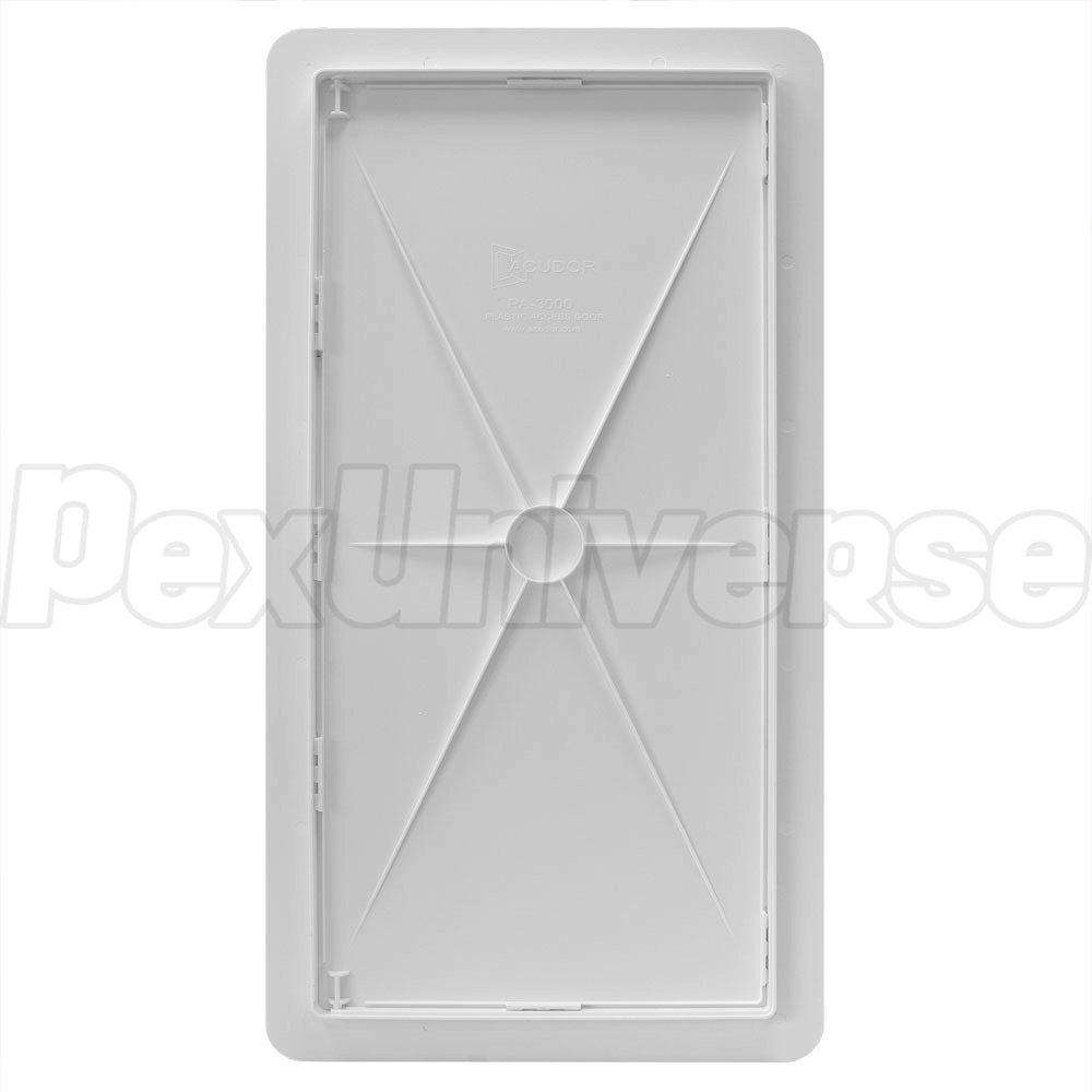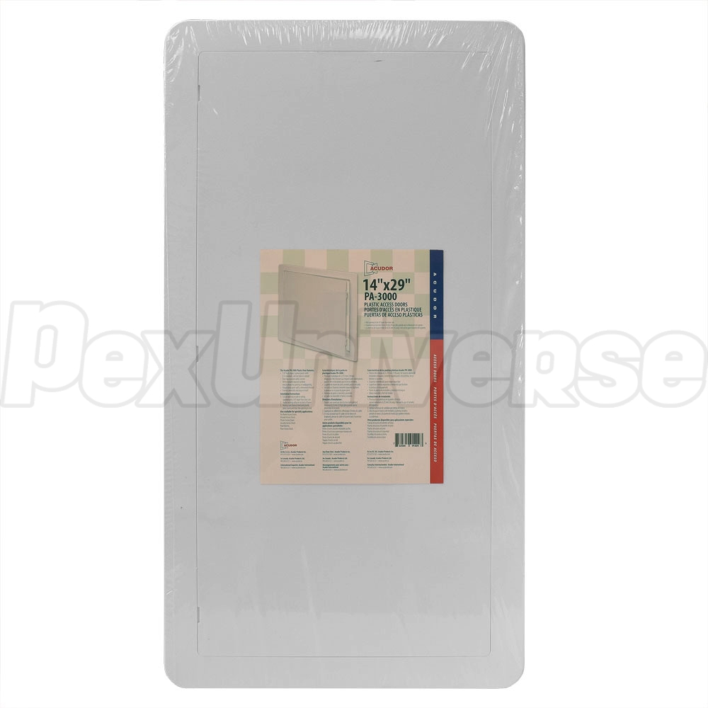 Acudor PA-3000 series, 14" x 29" (WxH) plastic access door/panel suitable for installation on a wide range or wall or ceiling surfaces, including drywall, tile, masonry, etc. The hinged door is removable. Snap latch design ensures secure locking. Perfect for indoor applications such as access to plumbing valves, radiant floor heating, utility or electrical components (where permitted by code).