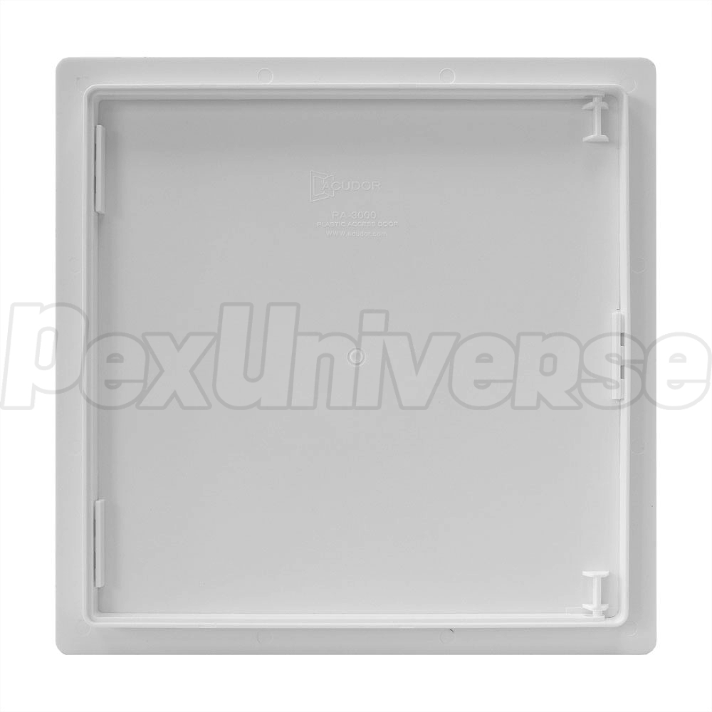 Acudor PA-3000 series, 22" x 22" plastic access door/panel suitable for installation on a wide range or wall or ceiling surfaces, including drywall, tile, masonry, etc. The hinged door is removable. Snap latch design ensures secure locking. Perfect for indoor applications such as access to plumbing valves, radiant floor heating, utility or electrical components (where permitted by code).