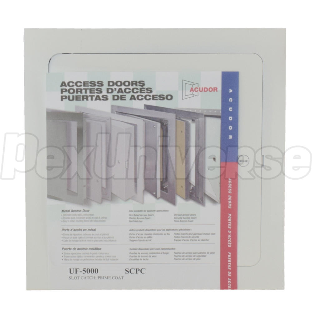 Acudor UF-5000 series, 8" x 8" metal access door suitable for wall or ceiling installation on drywall, tile or masonry. Flush installation, concealed hinge and a rounded corners panel with cam latch type lock make this door an ideal choice in plumbing, mechanical or electrical applications (where allowed by code) in residential and commercial buildings.