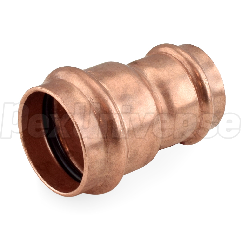 This press coupling fitting (with internal stop) connects 1-1/2" to 1-1/4" copper pipes together in a straight line.