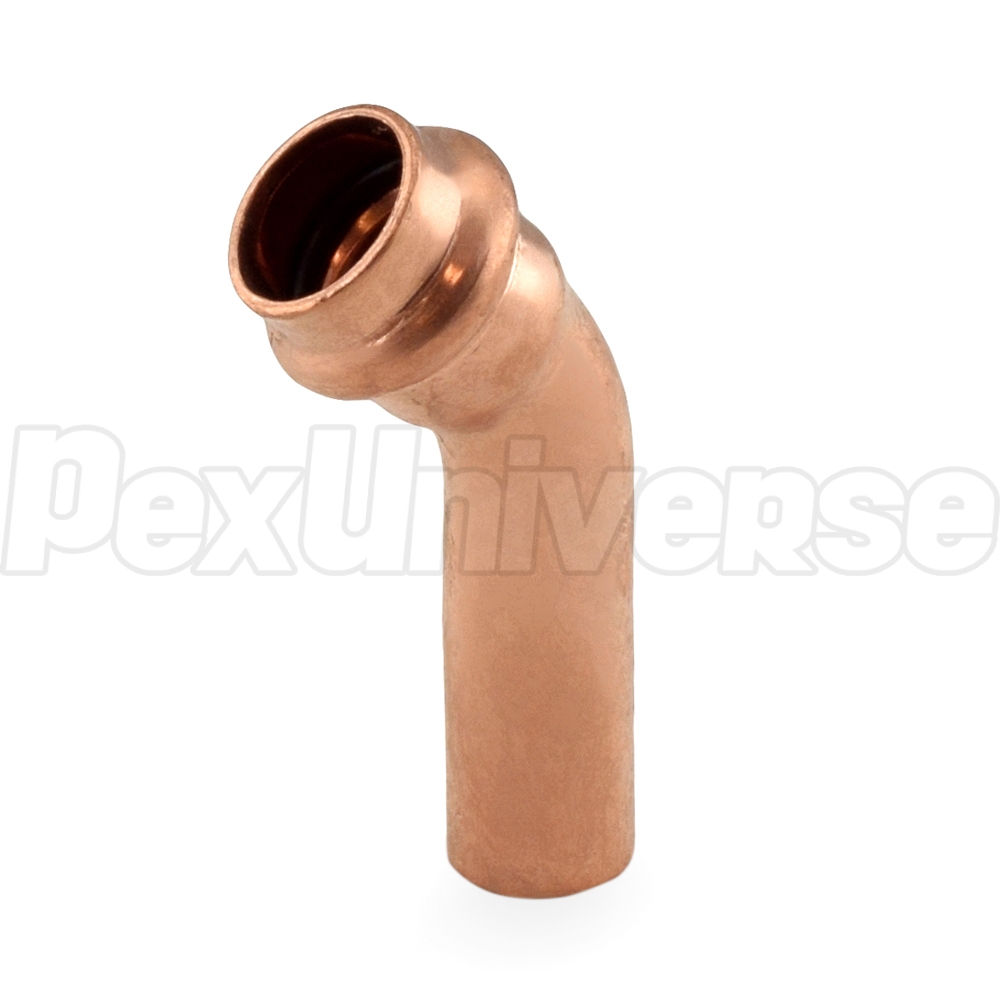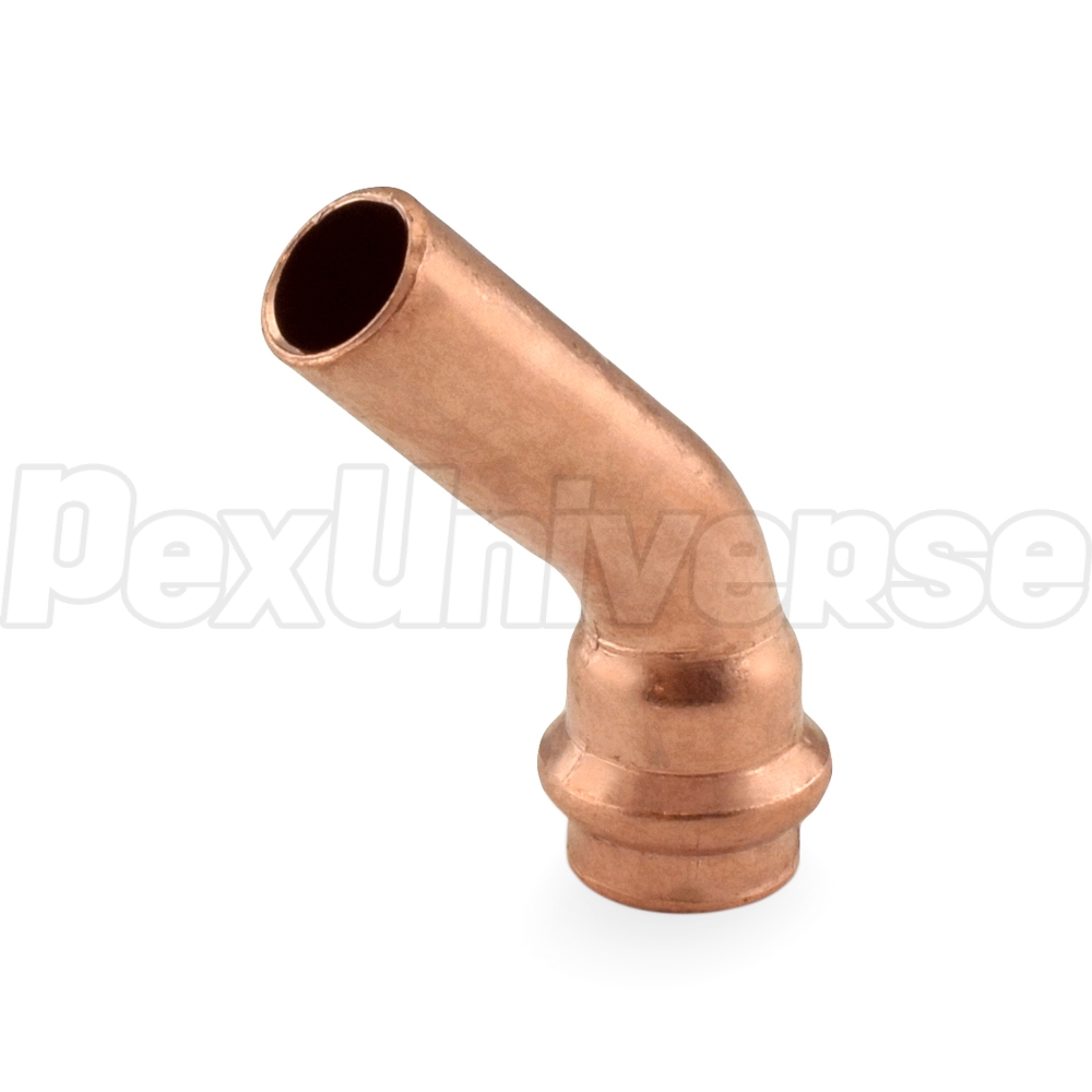 This press elbow fitting connects 1/2" copper pipe to 1/2" press fitting outlet at a 45-degree angle.