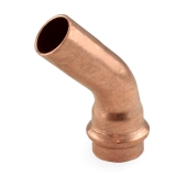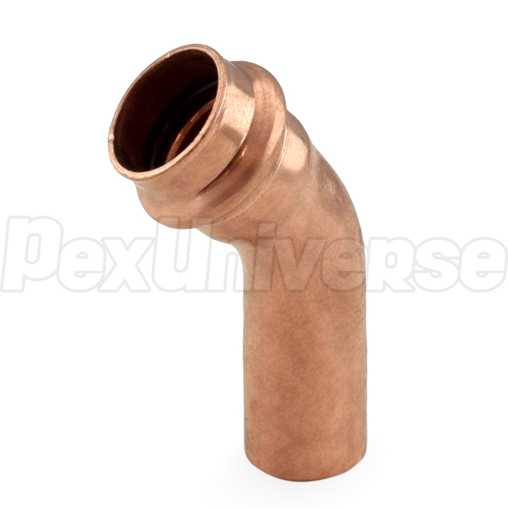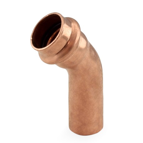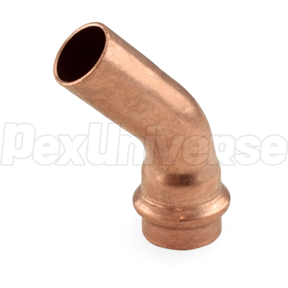 This press elbow fitting connects 3/4" copper pipe to 3/4" press fitting outlet at a 45-degree angle.