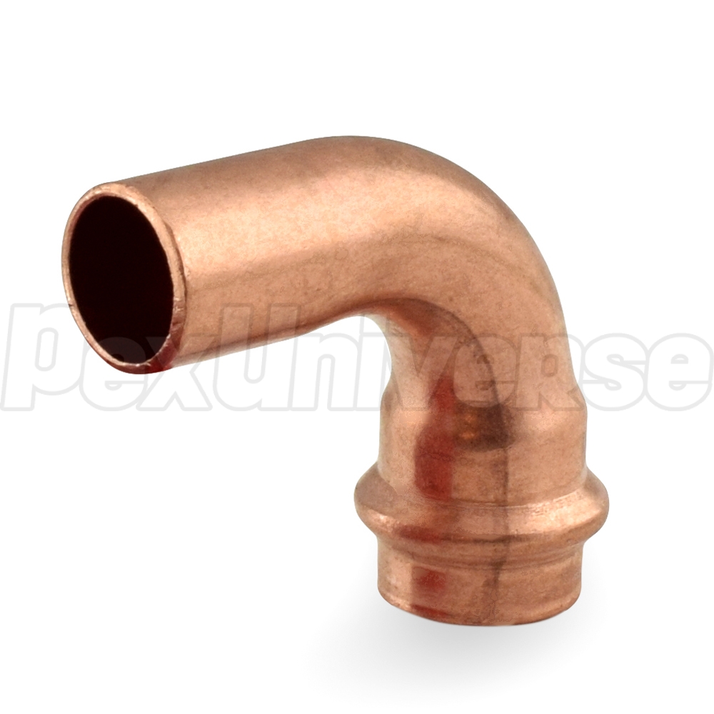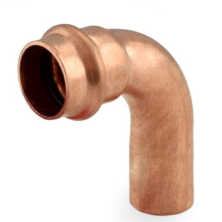 This press elbow fitting connects 3/4" copper pipe to 3/4" press fitting outlet at a 90-degree angle.