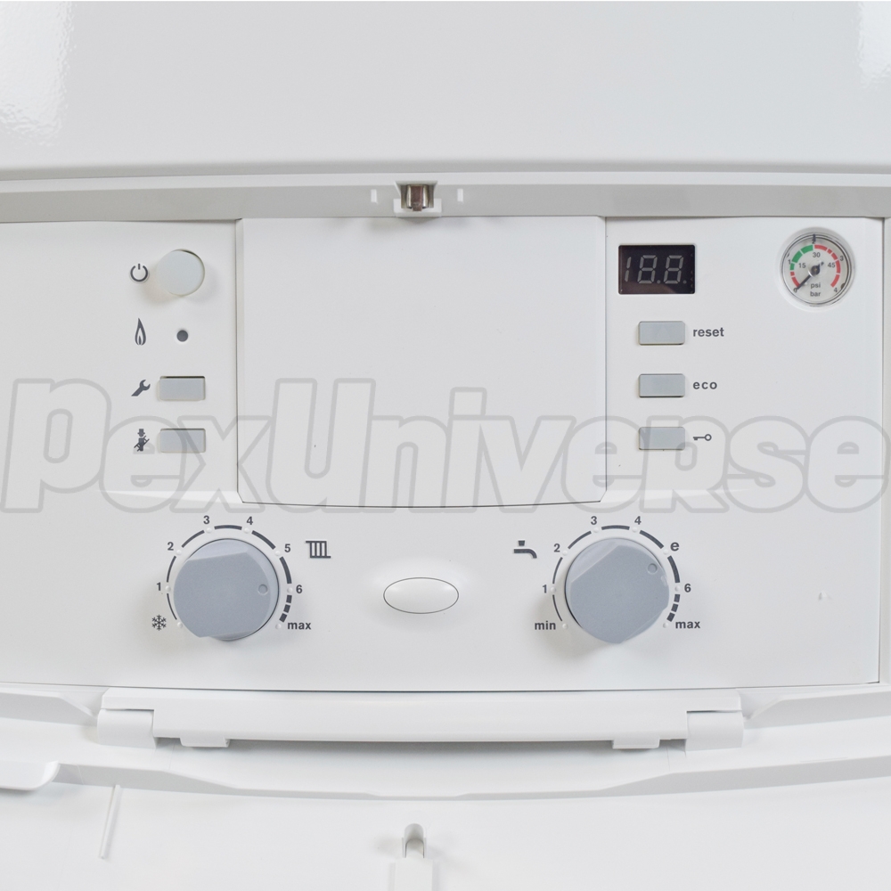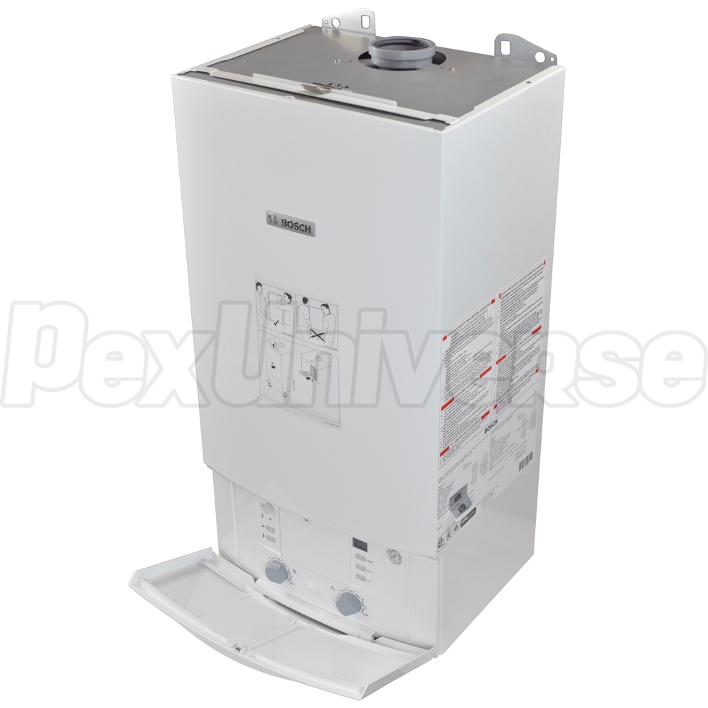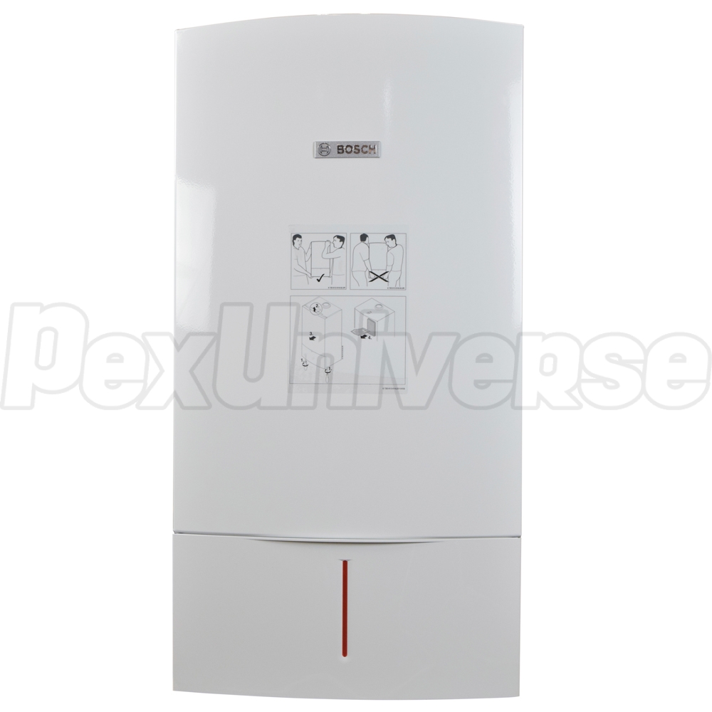 Bosch Greenstar series, 151-ZWB42-3 model, wall-mounted combi gas condensing boiler (heat + tankless DHW) with 117,000 kBTU (Net) rating. Energy Star rated. Built-in heat pump, exchanger and expansion tank. Includes LPG conversion kit, 3" twin pipe adapter and outdoor reset control.