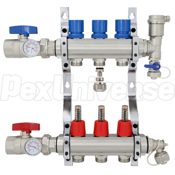 (1) Supply side radiant manifold w/ (3) adjustable flow indicators and (3) outlets for PEX tubing.