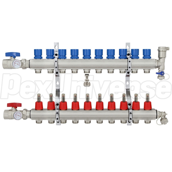 (1) Supply side radiant manifold w/ (10) flow indicators and (10) outlets for PEX tubing.