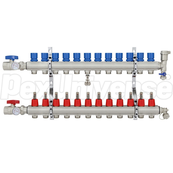 (1) Supply side radiant manifold w/ (12) flow indicators and (12) outlets for PEX tubing.