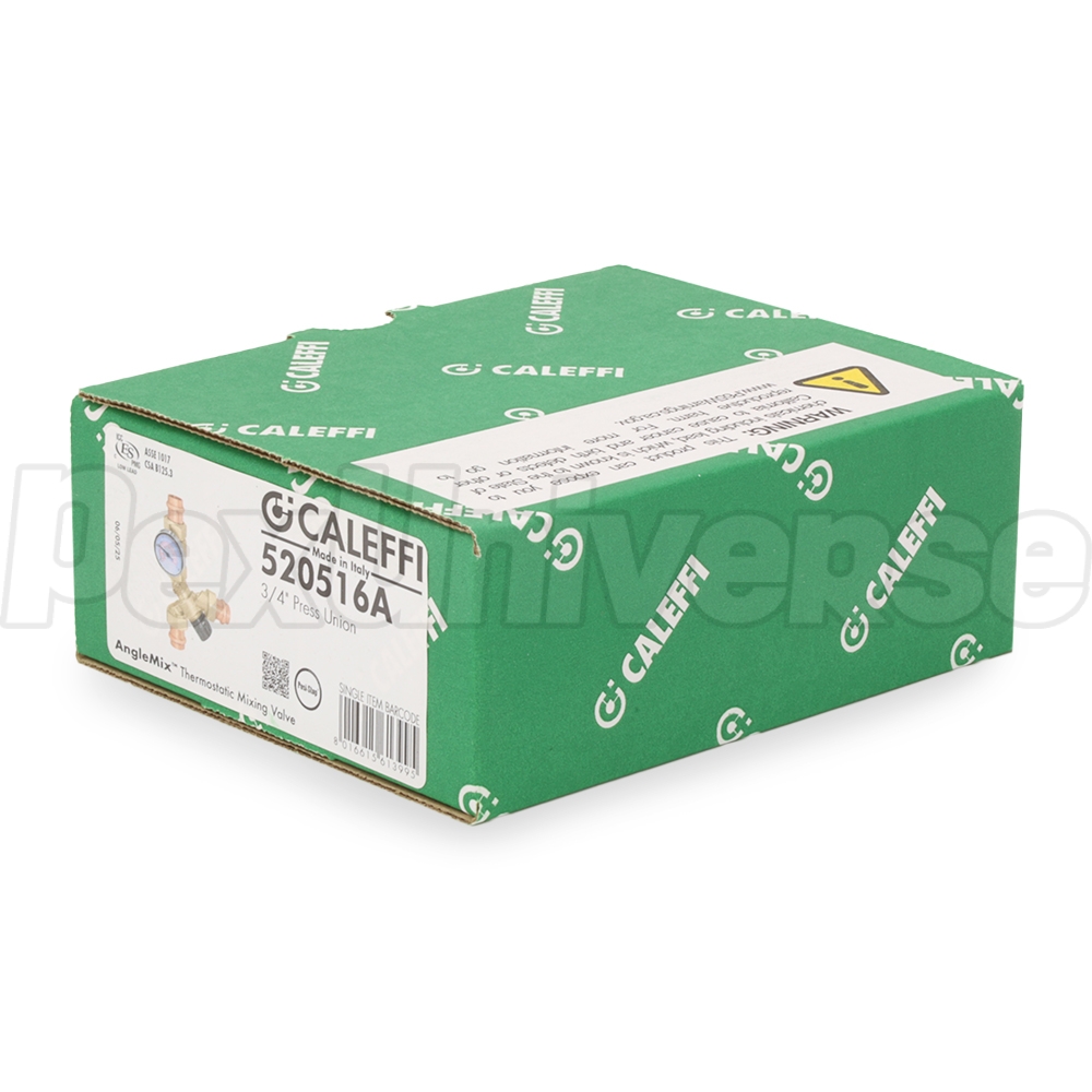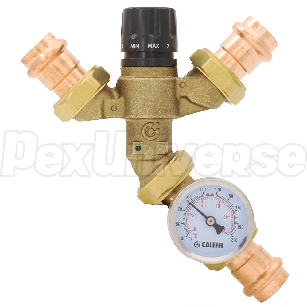 Caleffi AngleMix series themostatic mixing valve with temperature gauge and 3/4" copper press connections, designed for mixing of hot and cold water with precise temperature output in plumbing & heating systems.