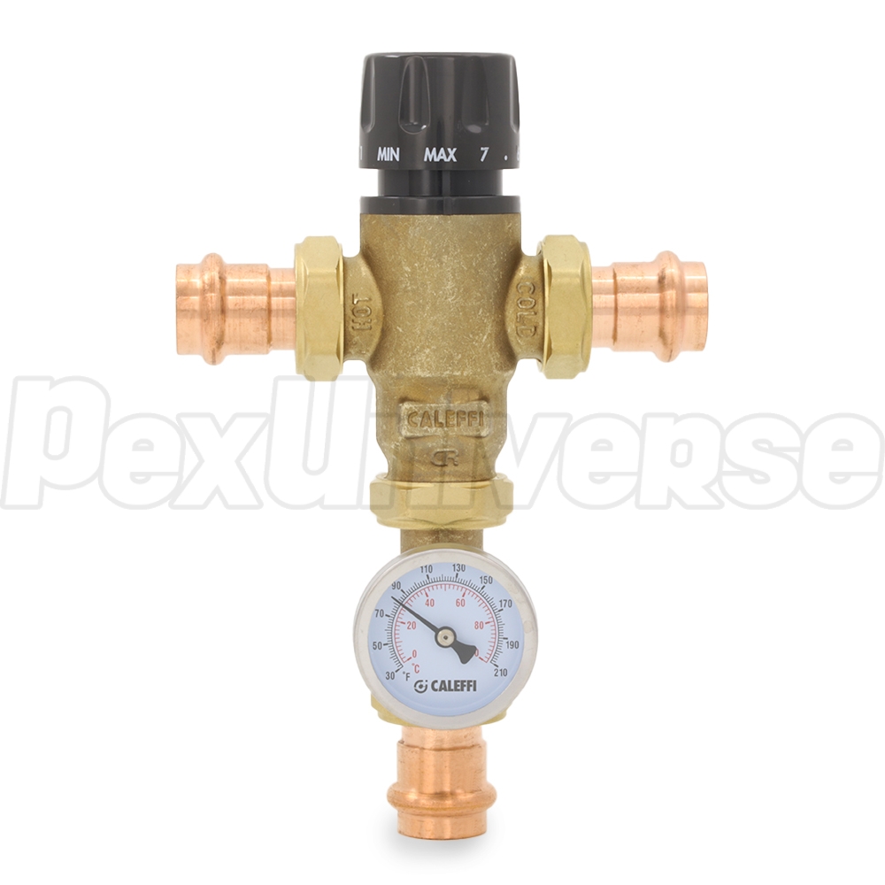 3/4" Press Union, MixCal Mixing Valve (Lead-Free) w/ Temperature Gauge, 85-150F