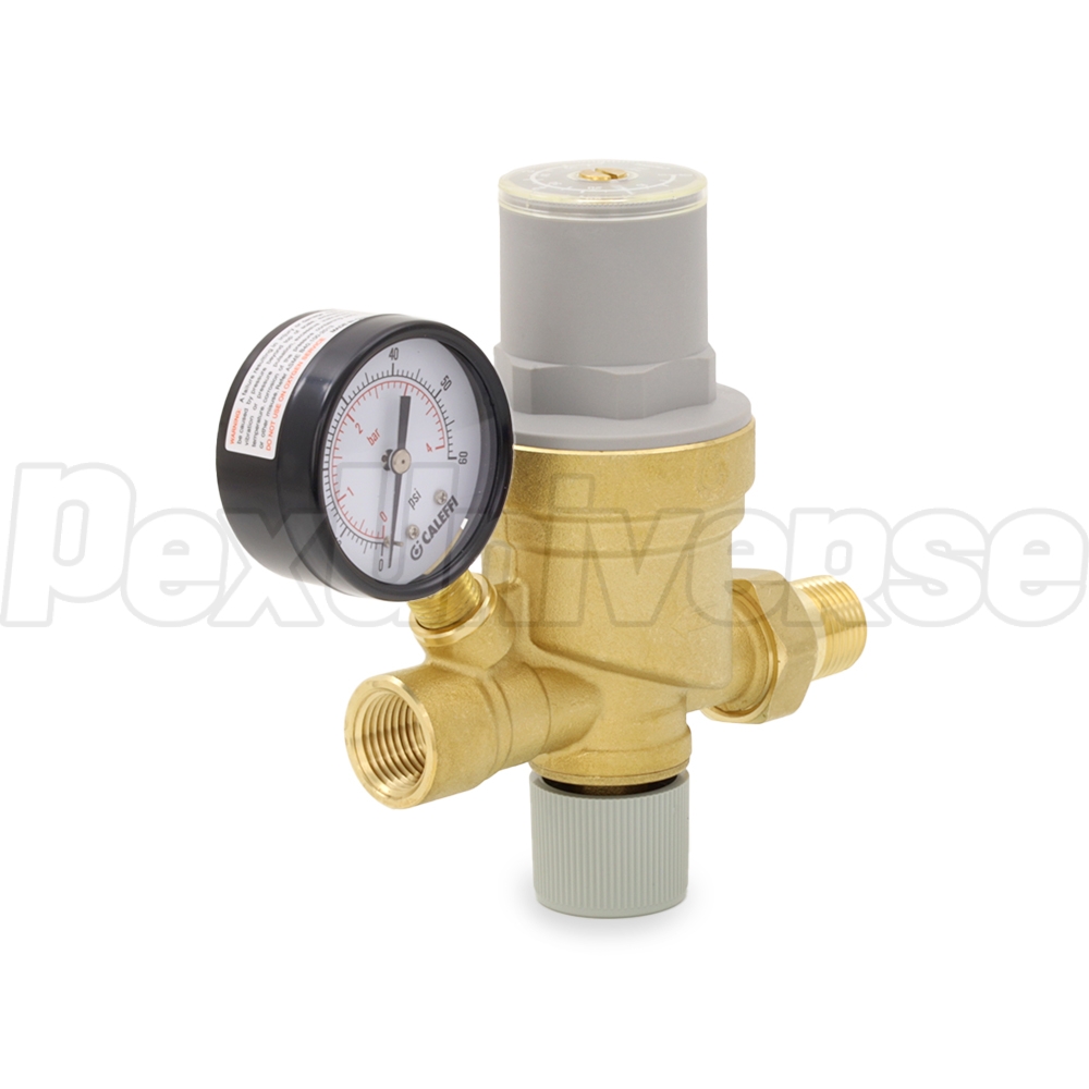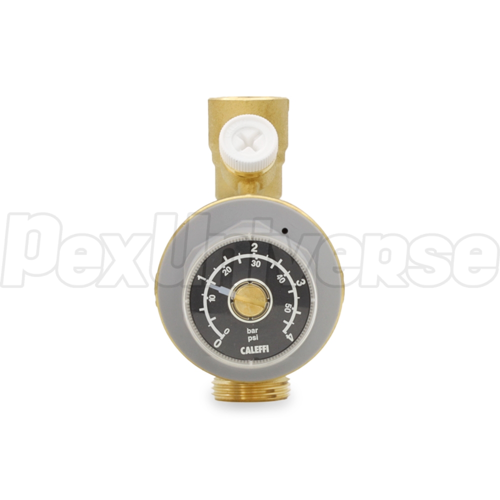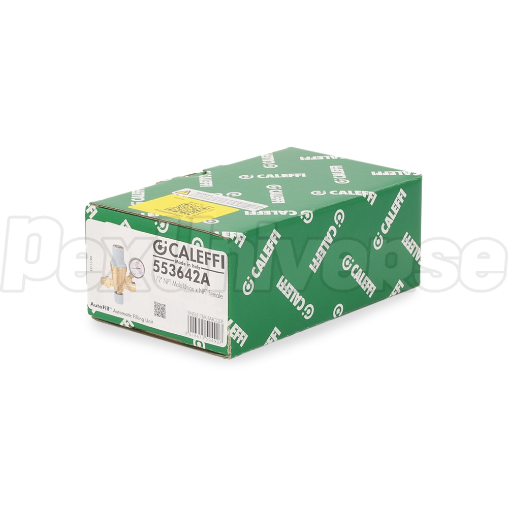 Caleffi AutoFill series pressure reducing boiler fill valve with pressure gauge and 1/2" Male NPT Union x 1/2" Female NPT connections. Commonly used for cold water feed into a heating system. Factory pre-set to 15 psi. AutoFill valve is packed with features, including a pressure gauge (removable and replaceable with any 1/8" NPT gauge), visual pressure setting indicator (adjustable from the top with a standard flat head screwdriver), positive shut-off (round knob at the bottom), built-in & removable fine mesh screen/strainer, anti-scale internal components (prevents scale build-up), replaceable cartridge design, built-in check valve and many others. Unlike with other boiler fill valves, where it is necessary to hold the fill lever open and wait until the system fills, Caleffi AutoFill feature automatically fills the system to the pre-set pressure. Made in Italy.