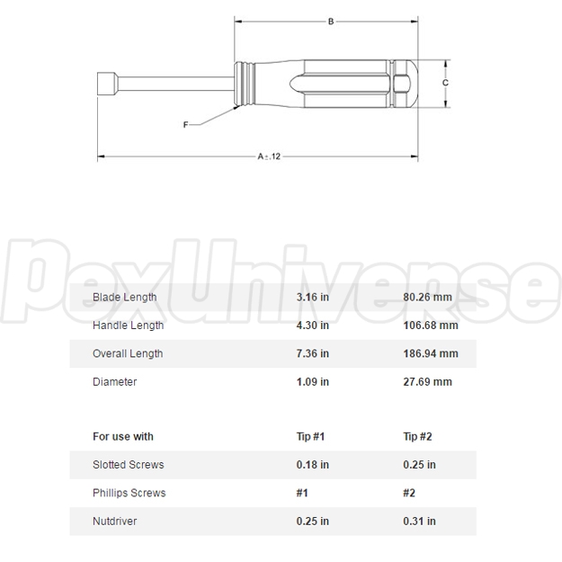 Includes: Slotted bits (3/16", 1/4"), Phillips bits (#1, #2), Nutdriver (1/4", 5/16").