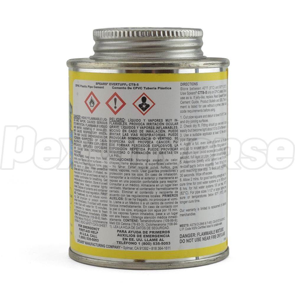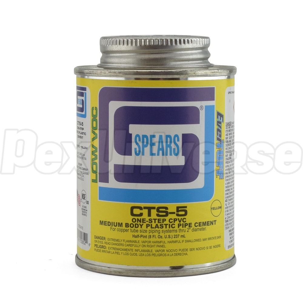 8 oz can with dauber of CTS-5 series EverTUFF CPVC cement intended for use with CTS (Copper Tubing Size) CPVC pipe and fittings up to 2" in size. This 1-step cement is formulated for use without primer if local code permits. Compatible with Spears, Lasco and other brand pipe and fittings.