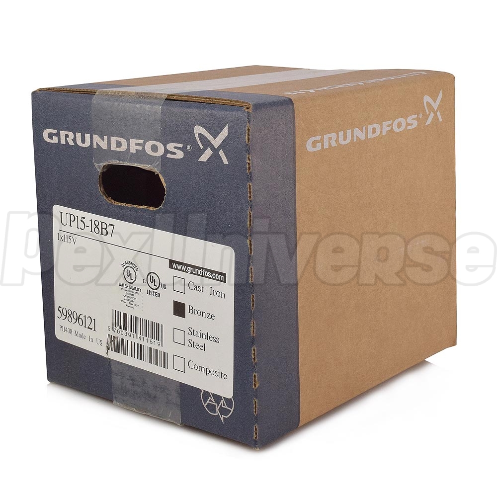 The Grundfos UP15-18B7 (Grundfos SKU# 59896121) is a 1/25HP, 1-speed, Bronze Circulator Pump with 3/4" Sweat connections. This model is commonly used in hot water recirculation, solar heating, chilled water cooling, radiant and other types of open or closed loop heating systems. Bronze pump housing offers improved corrosion resistance while built-in thermal protection extends circulator's life.