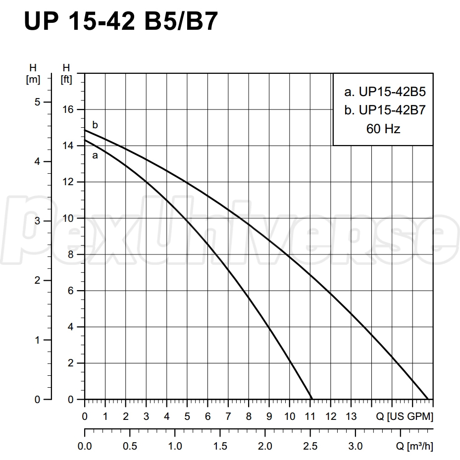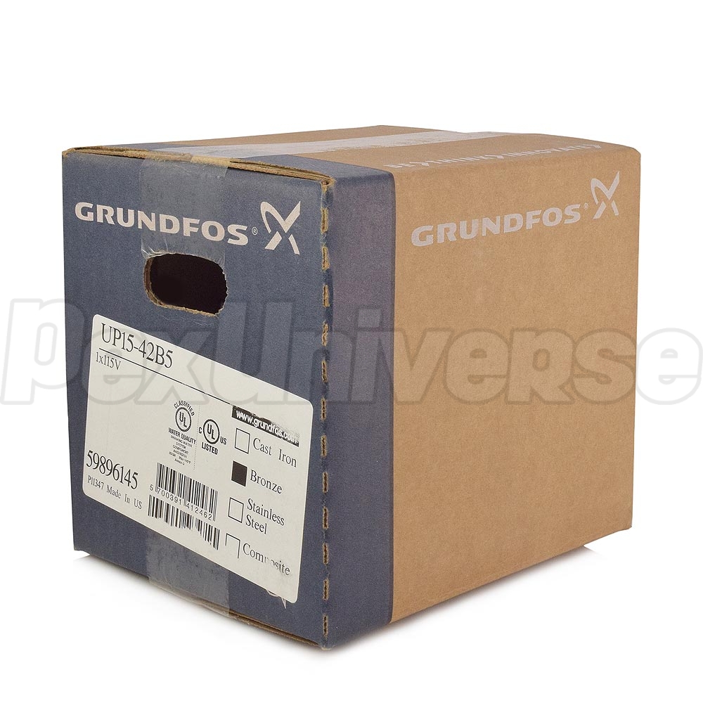 Grundfos UP15-42B5 (Grundfos SKU# 59896145) is a 1/25HP, single-speed Bronze Circulator Pump with 1/2" Sweat inlet/outlet connections. Bronze body of the Grundfos UP15-42B5 model improves corrosion resistance of the pump and allows to use it in both closed loop and open loop systems, such as radiant heating, domestic hot water recirculation, solar systems, etc.