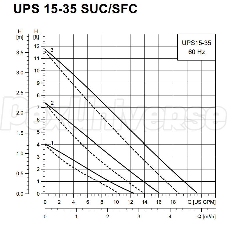 Grundfos UPS15-35SUC/TLC model is a 1/6HP, 3-Speed Stainless Steel Circulator Pump (Grundfos SKU# 99452478) with Timer, removable Integral Check Valve, 1-1/4" union connections (GU125) and a 6-foot long grounded power cord.