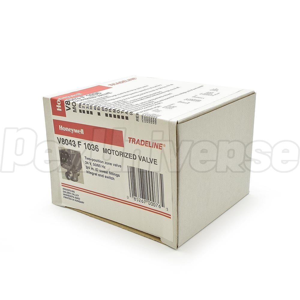 Honeywell V8043F1036 3/4" Sweat Connection two-way on-off low voltage motorized zone valve with 3.5 Cv capacity and screw terminal block electrical connections, consists of an actuator and valve assembly for controlling the flow of hot water.