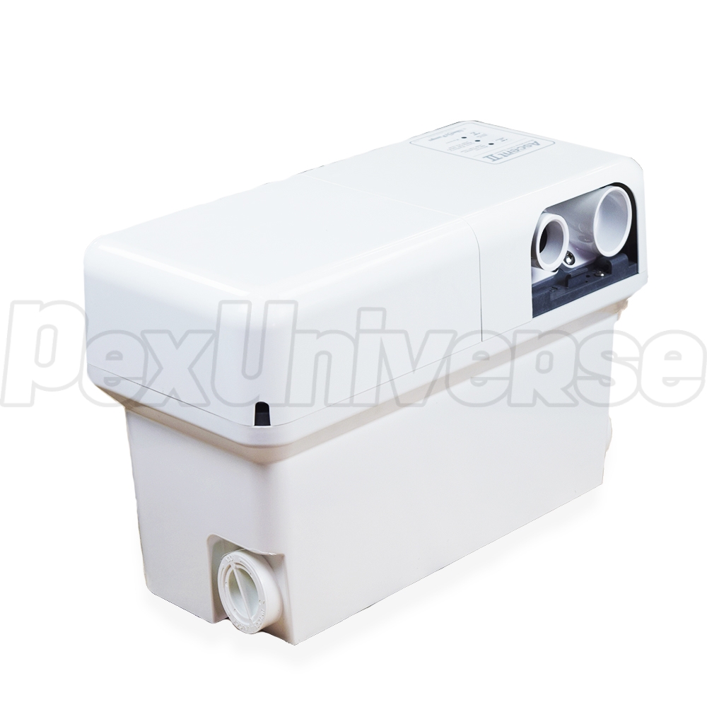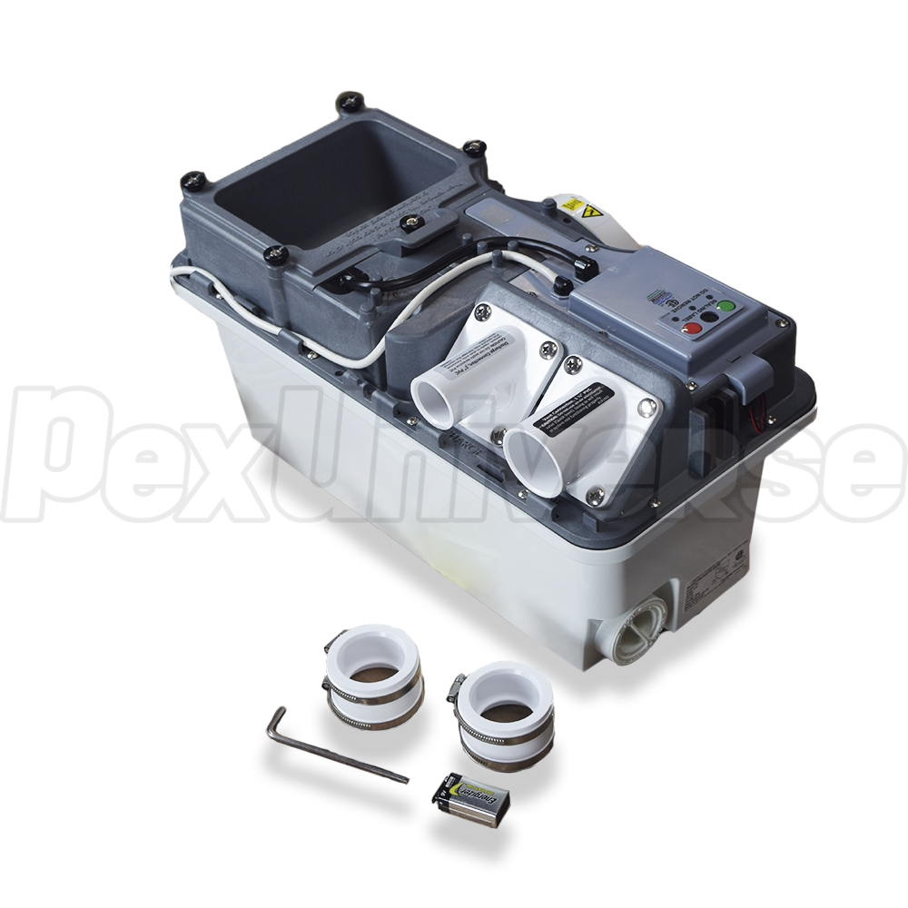 Improved Solid state electronic switch system provides intelligent data exchange with system operation which eliminates older style mechanical or diaphragm switches, auxiliary inlets on each side of unit allow for connection of a lavatory and/or shower. White couplers. The Liberty ASCENTII-MUW Macerating Unit accepts 1-1/2" or 2" pipe, features a built-in alarm with 9 volt battery back-up and push-to-silence switch, a LED