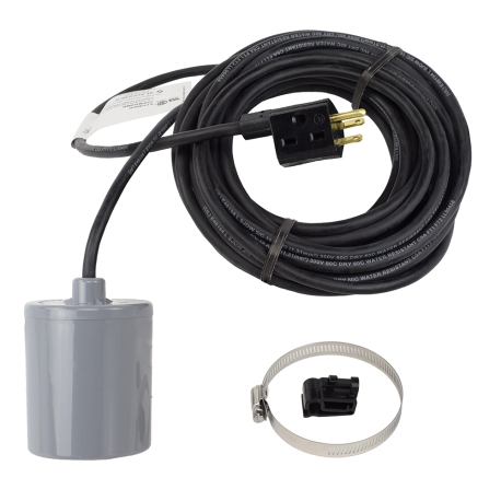Wide-angle style float switch with 35ft cord & 230V piggyback type plug. Includes hardware for securing the float switch to a 2" or 3" discharge pipe (Sch 40/80 PVC or ABS). For use with pumps up to 13A max (1 HP).
